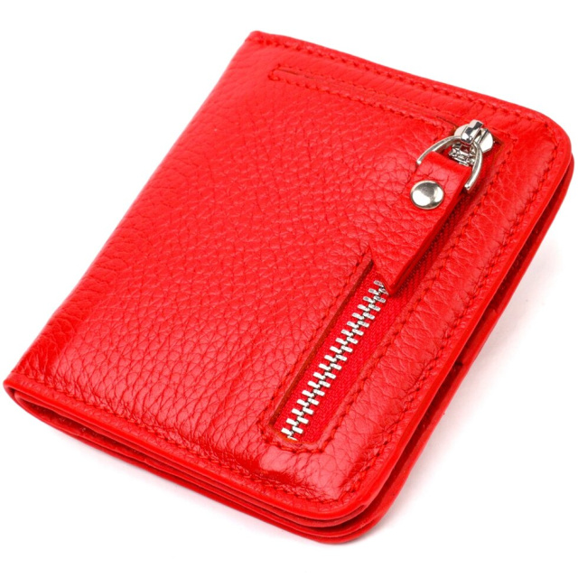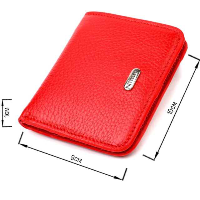 Практичний компактний гаманець із натуральної зернистої шкіри, в червоному кольорі, для суперстильних дівчат та жінок. Аксесуар має одне основне відділення з тканинною перегородкою в яке поміщаються купюри всіх номіналів, п'ять кишень для карток (одна під сіточкою), дві приховані кишені та монетницю. Закривається аксесуар навпіл на кнопку. На лицьовій стороні, вгорі посередині металевий логотип компанії виробника. Купуючи шкіряний аксесуар цієї фірми, собі чи на подарунок, будьте певні, що він прослужить Вам не один рік.