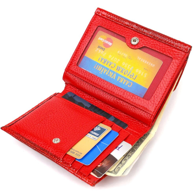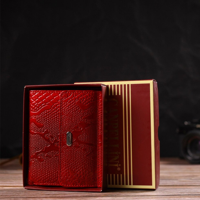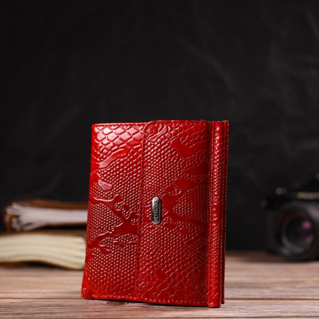 Яскравий жіночий гаманець середнього розміру із натуральної шкіри з тисненням під рептилію. Аксесуар має одне основне відділення з тканинною перегородкою в яке поміщаються купюри всіх номіналів, п'ять кишень для карток (одна під сіточкою), дві приховані кишені та монетницю. Закривається аксесуар у два складання на кнопку. Купуючи шкіряний аксесуар цієї фірми, собі чи на подарунок, будьте певні, що він прослужить Вам не один рік.
