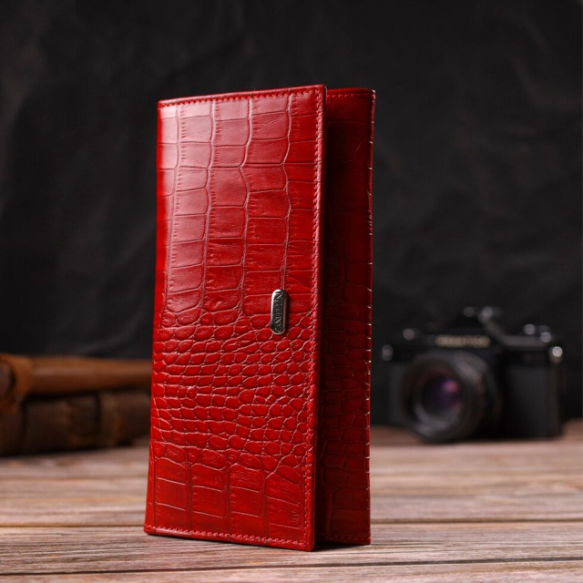 Чудовий фактурний жіночий гаманець горизонтального типу з натуральної шкіри із тисненням під крокодила. Аксесуар має одне основне відділення, шість кишень для карток (одна під сіточкою), одна прихована кишеня, три прилеглі кишені та монетниця. Закривається аксесуар клапаном на кнопку. Купуючи шкіряний аксесуар цієї фірми, собі чи на подарунок, будьте певні, що він прослужить Вам не один рік.