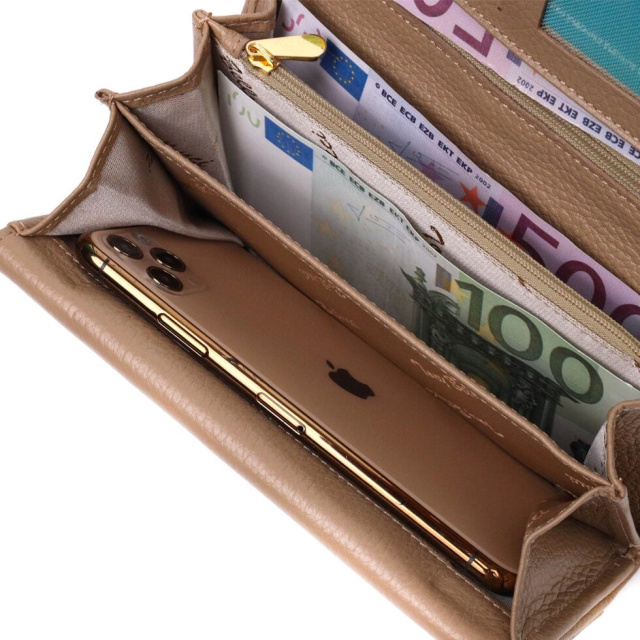Зручний жіночий гаманець із натуральної шкіри флотар, для якої характерна міцність, зносостійкість та зерниста фактура. Аксесуар складається з чотирьох широких відділень для купюр, одинадцяти осередків для пластикових карток, двох прилеглих кишень та трьох кишень на блискавках, які можна використовувати як монетниці. У виробі використано якісну фурнітуру золотистого кольору. Закривається гаманець клапаном на кнопку. Купуючи шкіряний гаманець собі або на подарунок усі хочуть отримати якісну та стильну річ, саме такі вироби представлені у нашому магазині, а наші досвідчені менеджери допоможуть визначитися з вибором.