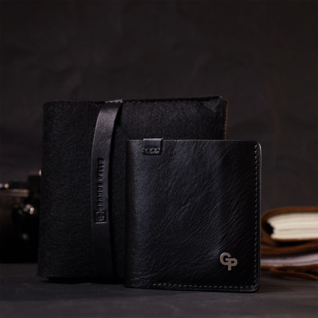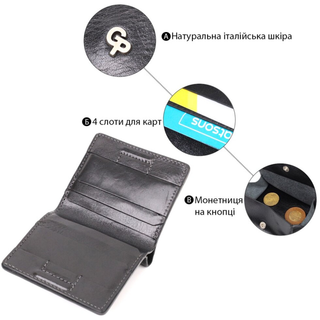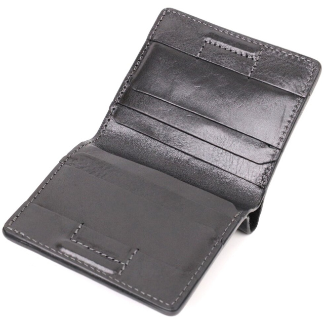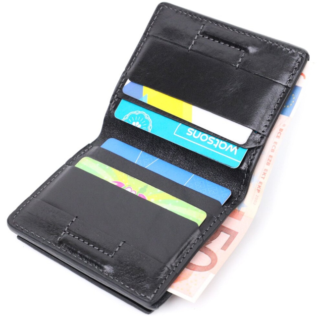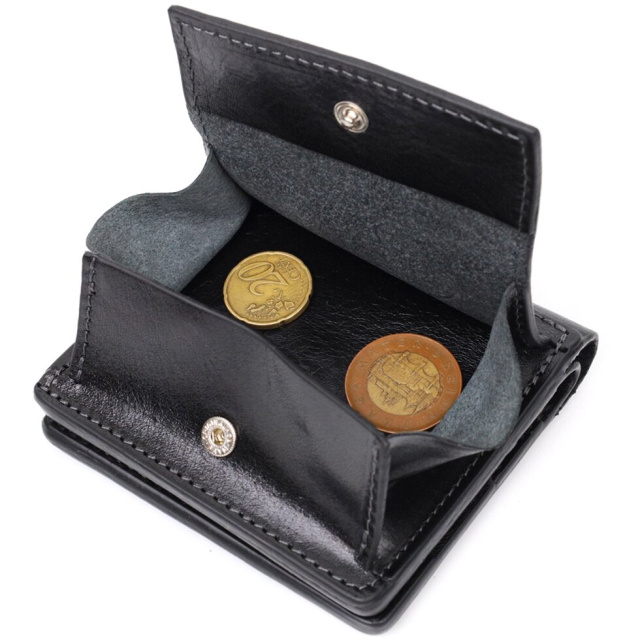 Чоловіче класичне портмоне з італійської натуральної гладкої шкіри найвищої якості. Аксесуар має компактний розмір та витриманий строгий дизайн. Портмоне легко поміститься в кишеню штанів або маленьку сумку. По краях виріб прошито рівним чорним рядком у дизайн виробу. Портмоне буде ідеальним подарунком для близької людини. У комплекті йде фірмовий тканинний чохол.