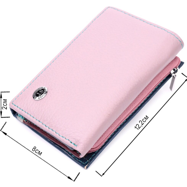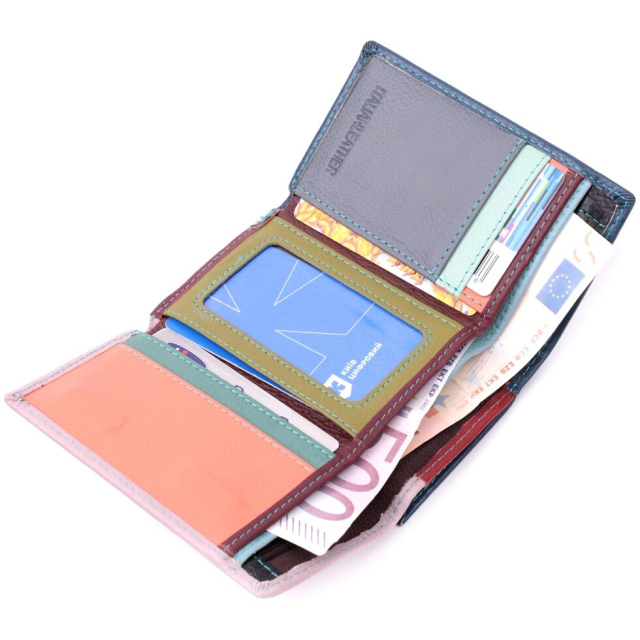 Якісне жіноче портмоне в три складання з натуральної шкіри найвищої якості. Перше, що впадає в око це колірне рішення, замість однотонного аксесуара ми маємо різнокольоровий, який містить два основні зовнішні кольори і кілька додаткових всередині. Шкіряне портмоне дуже практичне і служить досить довго. Аксесуар складається з двох містких кишень для купюр, кишені на блискавці через всю довжину, п'яти осередків для карт, прозорого віконця для пропуску та зовнішньої кишені на блискавці з перегородкою, що чудово прослужить для монет. Портмоне доповнено надійною фурнітурою. Укомплектований гаманець у фірмову картонну коробку білого кольору.