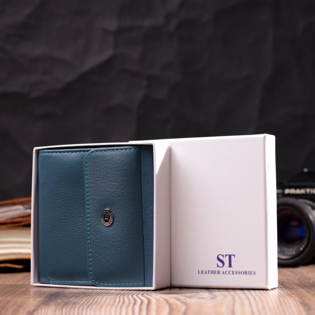 Якісне кольорове портмоне для жінок середнього розміру із натуральної шкіри найвищої якості. Акцентом цього гаманця є колір, точніше кілька кольорів – він темно-бірюзового кольору зовні та багатобарвний усередині. Аксесуар складається з двох містких відділень для купюр, кишені на блискавці, чотирьох осередків для карт, прихованої кишені, прозорої кишені та кишені для монет. Зовні виріб прошитий рівним рядком бірюзового кольору по краю і прикрашений металевим логотипом компанії виробника, який розміщений вгорі посередині. Портмоне доповнено надійною фурнітурою та міцною підкладкою. Укомплектований гаманець у фірмову картонну коробку білого кольору.