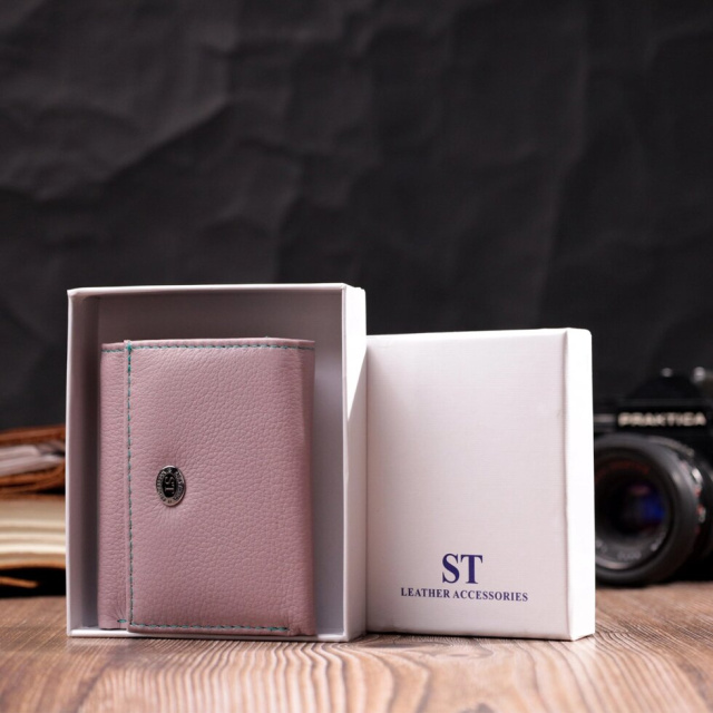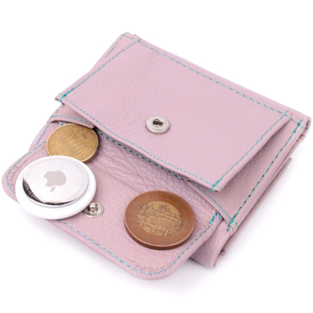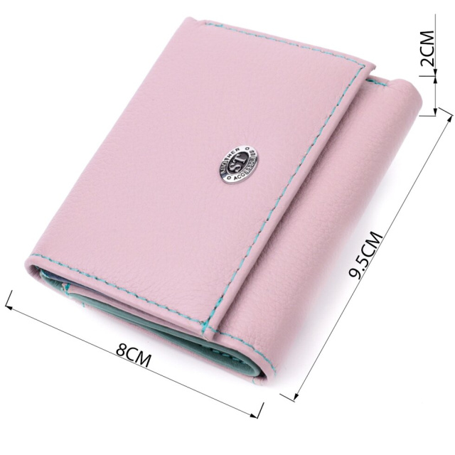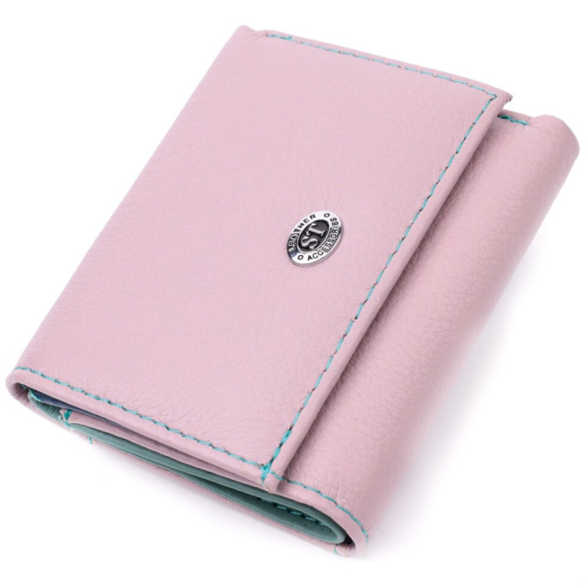 Ніжне жіноче портмоне в три складення з натуральної шкіри найвищої якості. Акцентом цього гаманця є колір, точніше кілька кольорів – він бежево-рожевого кольору зовні та багатобарвний усередині. Аксесуар складається з двох містких відділень для купюр, двох осередків для карток та кишені для монет. Зовні виріб прошитий рівним рядком бірюзового кольору по краю і прикрашений металевим логотипом компанії виробника. Портмоне доповнено надійною фурнітурою та міцною підкладкою. Укомплектований гаманець у фірмову картонну коробку білого кольору.