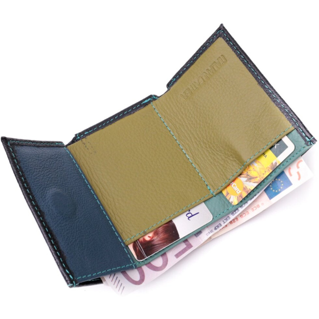 Практичне жіноче портмоне в три складення з натуральної шкіри найвищої якості. Акцентом цього гаманця є колір, точніше кілька кольорів – він чорного кольору зовні та багатобарвний усередині. Аксесуар складається з двох містких відділень для купюр, двох осередків для карток та кишені для монет. Зовні виріб прошитий рівним рядком бірюзового кольору по краю і прикрашений металевим логотипом компанії виробника. Портмоне доповнено надійною фурнітурою та міцною підкладкою. Укомплектований гаманець у фірмову картонну коробку білого кольору.