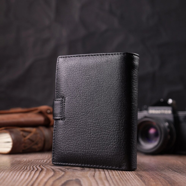 Добротне чоловіче портмоне, яке прикрашене металевим логотипом виробника на лицьовій стороні. Аксесуар з натуральної шкіри, він складається з одного відділення для купюр, кишені на блискавці, чотирьох осередків для карт, трьох прихованих кишень, двох кишень під плівкою та кишені для монет. Портмоне доповнено надійною фурнітурою та міцною підкладкою, закривається навпіл, хлястиком на кнопку. Шкіряний та якісний аксесуар на подарунок, це завжди дуже хороша ідея.