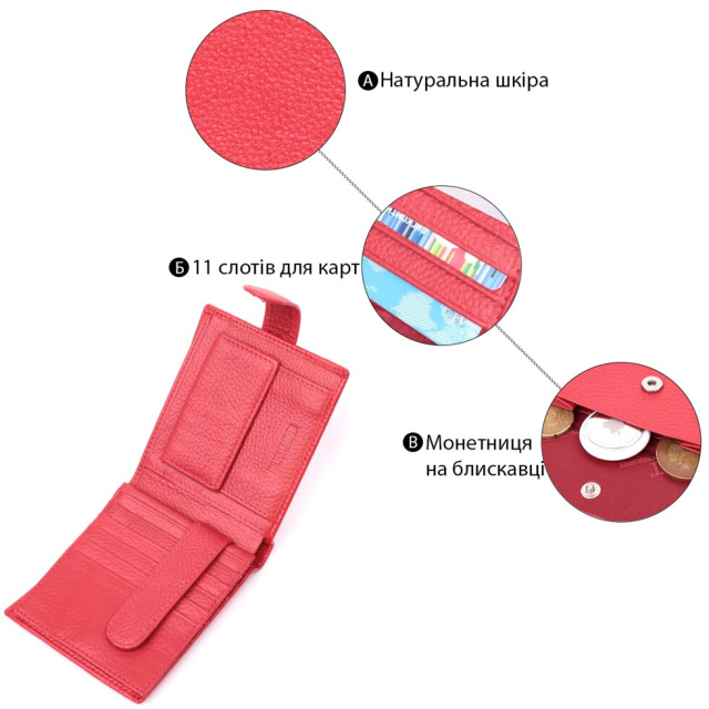 Жіноче яскраве портмоне, середнього розміру, що закривається хлястиком на кнопку. Модель пошита з якісної шкіри, яка чудово проявила себе у довгостроковій експлуатації. Аксесуар складається з двох відділень для купюр, двох прихованих кишень, одинадцяти осередків для пластикових карток, кишені під плівкою та монетниці. Модель упакована в коробочку, що дуже зручно, якщо виріб призначений для подарунка.