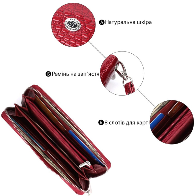 Зручний гаманець-клатч для ділових та заповзятливих людей. Виконаний з м'якої першокласної лакованої шкіри високої якості з тисненням під рептилію. Колір виробу – червоний. Має одне основне відділення, яке закривається на блискавку. Усередині є багато відділень для купюр, осередків для карт та монетниця. Для зручності використання також передбачений знімний кистьовий ремінь. Запакований аксесуар у білу щільну картонну коробку з фірмовим логотипом.