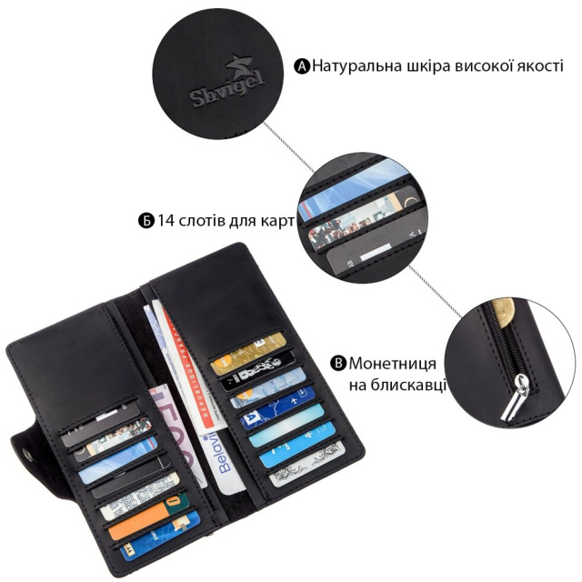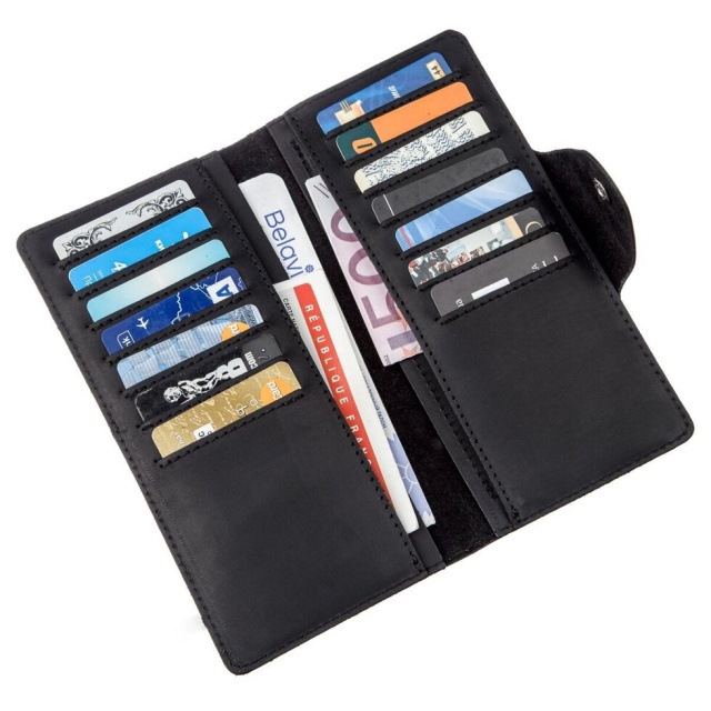 Колір чорний; Матеріал: натуральна шкіра високої якості; Розміри (ШхВ, см): 18х8,5х1; Країна виробник: Україна.Всередині: - 4 відділення для...