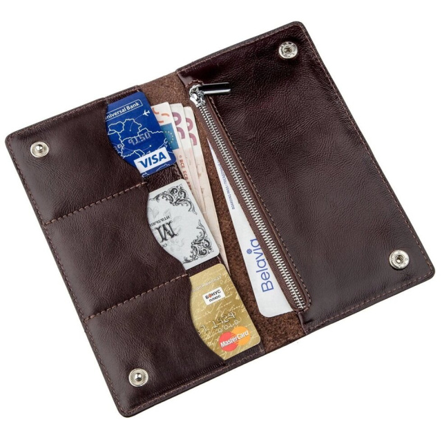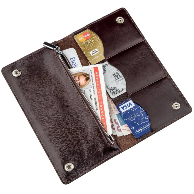 Солідний і м'який шкіряний гаманець. Аксесуар створений для чоловіків, які цінують стиль і комфорт. Виріб прошито по краях рівним рядком. Доповнює аксесуар тиснений логотип бренду на лицьовій стороні аксесуара. Виріб закривається на дві кнопки зверху і знизу. Такий гаманець стане прекрасним помічником для будь-якого чоловіка.