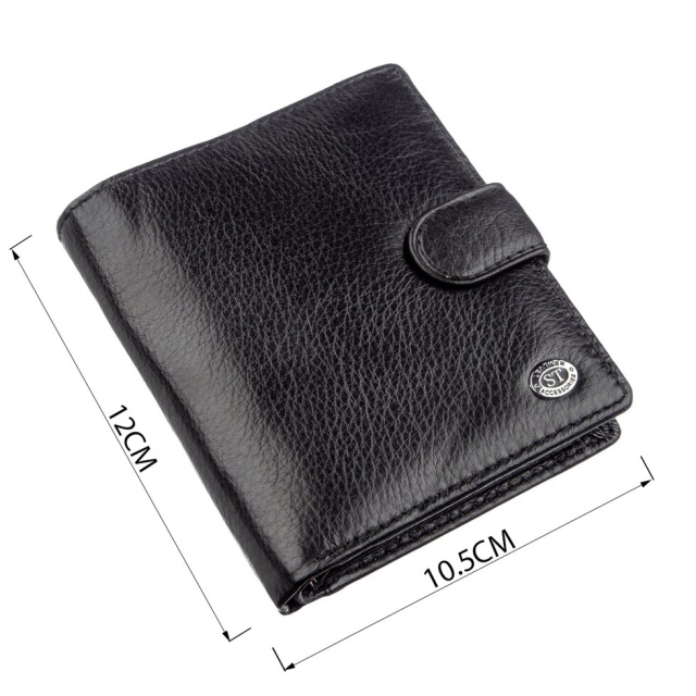 Шкіряний чоловічий гаманець чорного кольору невеликого розміру. Це відмінний варіант, якщо Ви не любите великі і громіздкі гаманці, які займають багато місця. Дана модель чудово поміститься в кишені, в невеликій барсетці або навіть в напоясній сумці. Гаманець має різні відділення і багато кишень для візиток і кредиток. Закривається він на зручну і практичну кнопку. Упаковано виріб в картонну білу коробку з фірмовим логотипом.