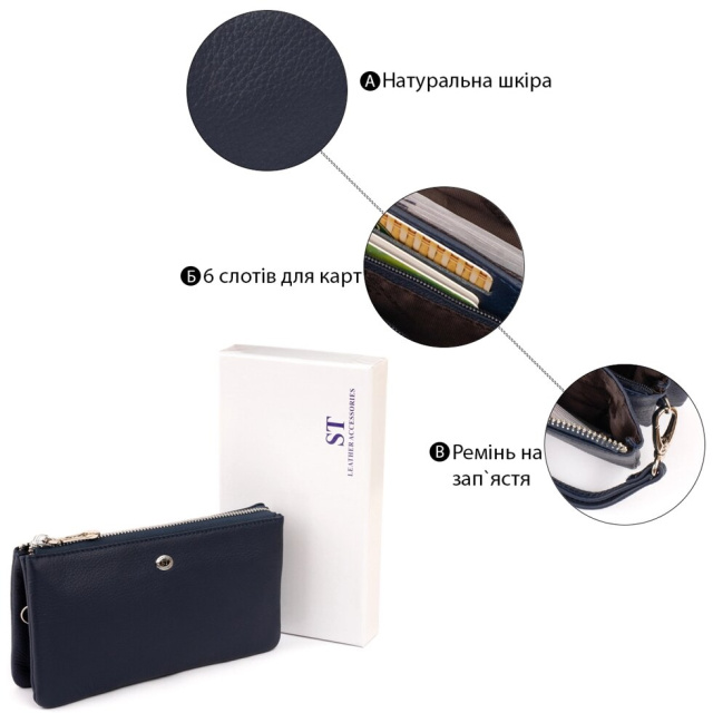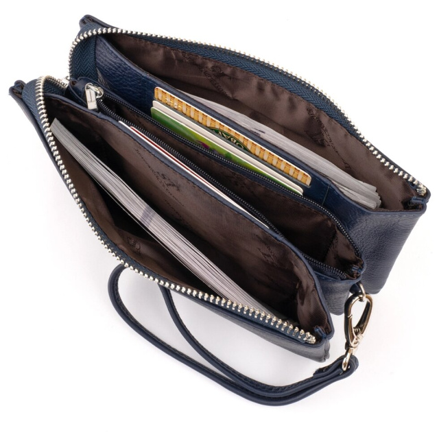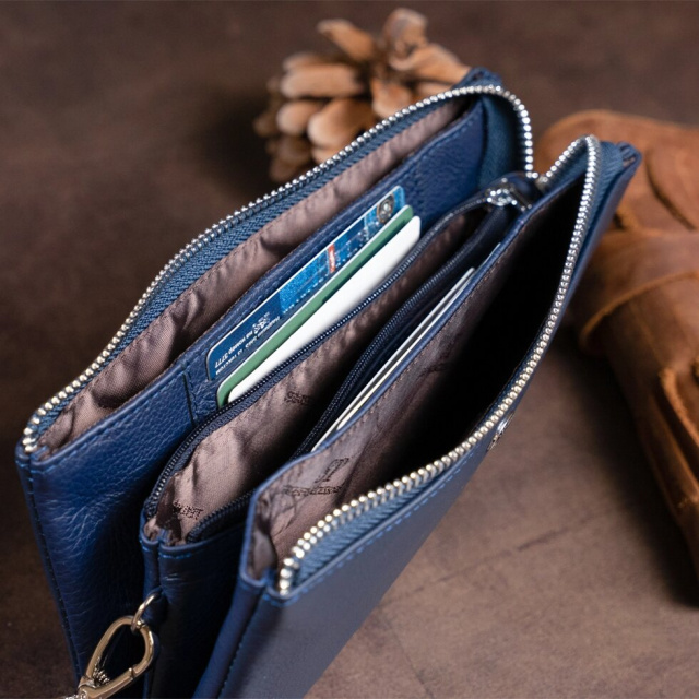 Універсальний жіночий клатч з натуральної шкіри синього класичного кольору. Модель надає впевненості і завершеності вашому образу. Виріб складається з двох містких кишень на блискавці і кишеньки перегородки на блискавці. Особливістю даного клатча є те, що ви можете помістити в нього паспорт і мобільний телефон. Глибокі кишені дуже правильно і практично продумані дизайнерами. Виріб має легкий запах натуральної шкіри. Сам клатч м'який і приємний на дотик. Усередині клатч зроблений з натуральної шкіри і щільного текстилю. У комплекті йде фірмова коробка з логотипом бренду. Шкіряний клатч стане найкращим подарунком для будь-якої дівчини.
