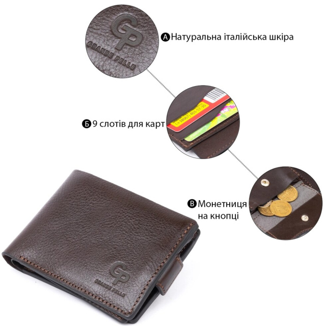 Стильне портмоне в дорогій гладкій шкірі найвищої якості. За функціональністю портмоне дуже практичне і доповнено всім необхідним. Виріб має два відділення для купюр, Монетницю на кнопці, досить слотів для карток. Закривається на магніт. Зручно сидить в руці. Продуманий дизайн виробу не залишить вас байдужим. З таким портмоне буде складно залишитися без компліментів. Замовляйте на нашому сайті по самій вигідній ціні і переконайтеся в відмінній якості виробу. В комплекті - фірмова коробка.