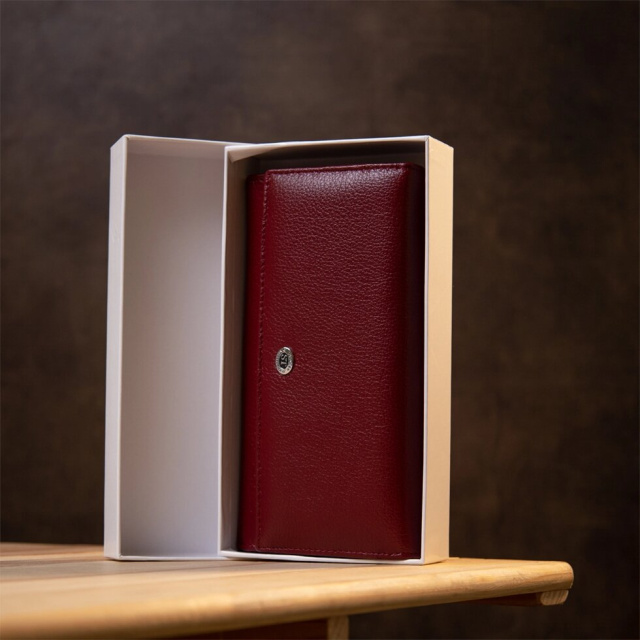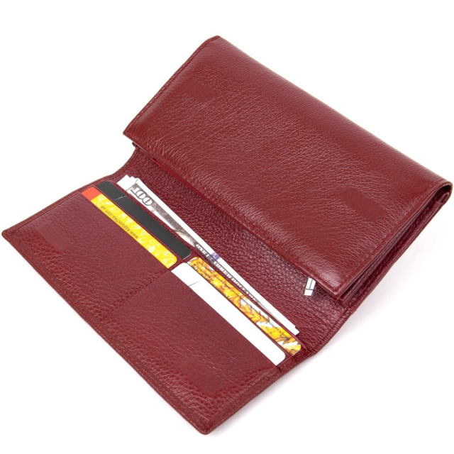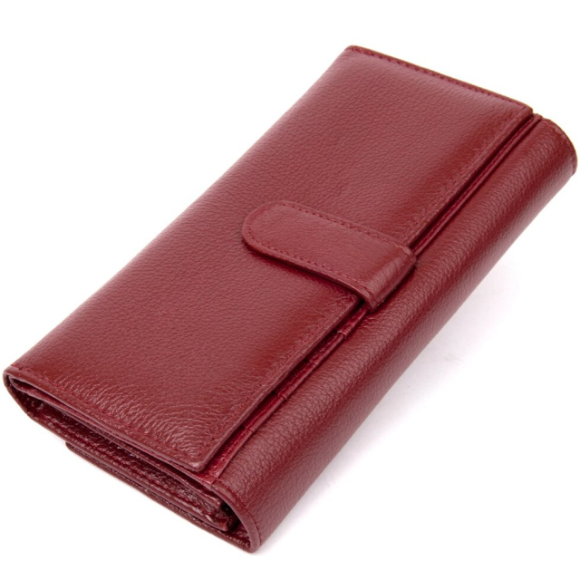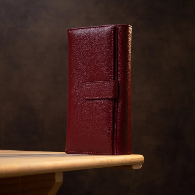 Шикарний жіночий гаманець в красивому темно-червоному кольорі. Виконаний з добротної високоякісної шкіри в зернистій фактурі. Дизайн даного виробу продуманий до дрібниць, тому гаманець обов'язково стане улюбленою річчю своєї господині. Відмінною рисою моделі є наявність додаткового відділення для карток, яке закривається на регульовану кнопку. Упакований в фірмову коробку.