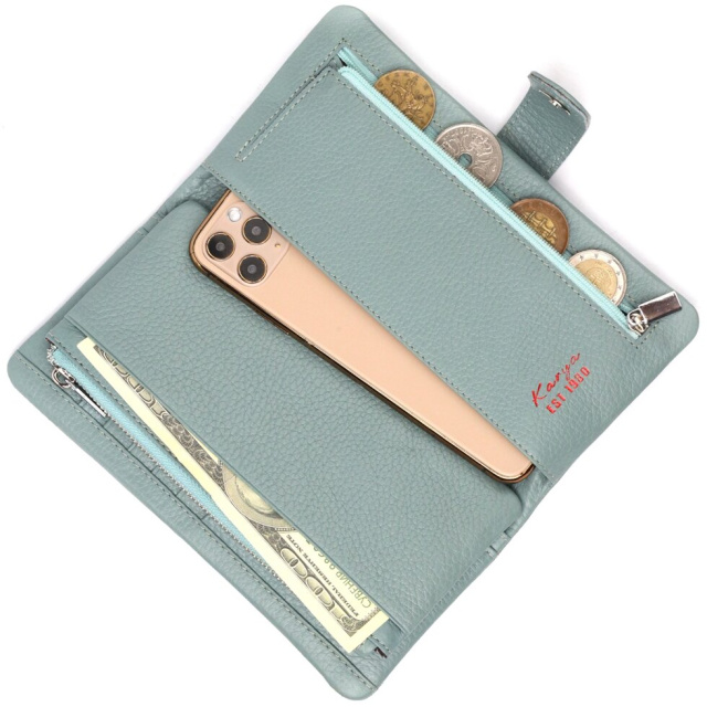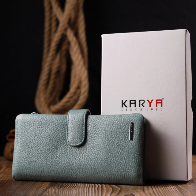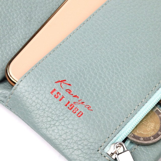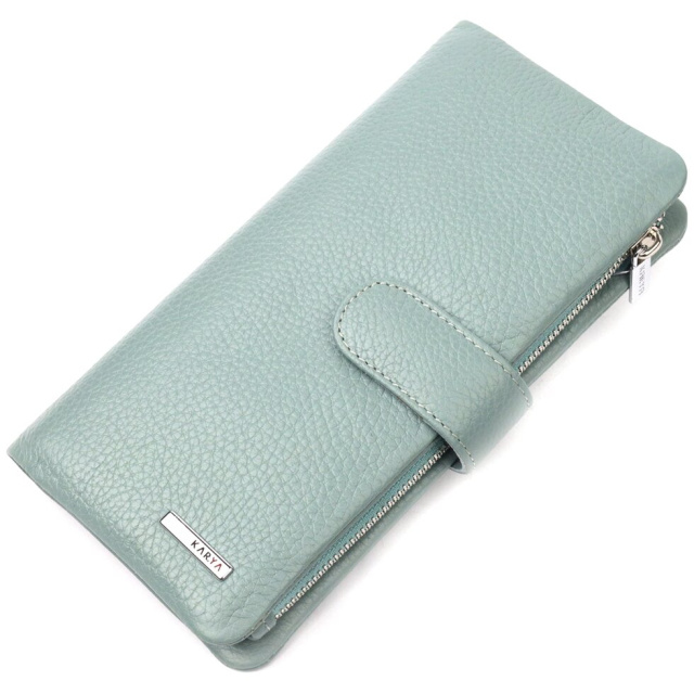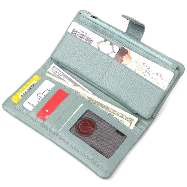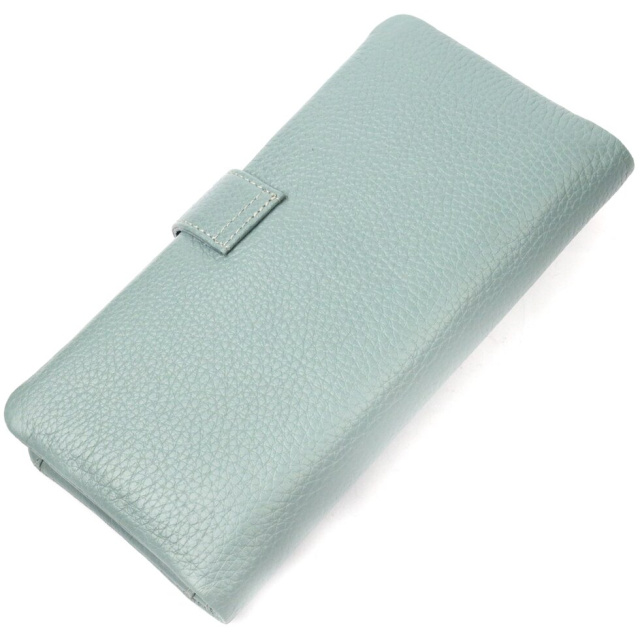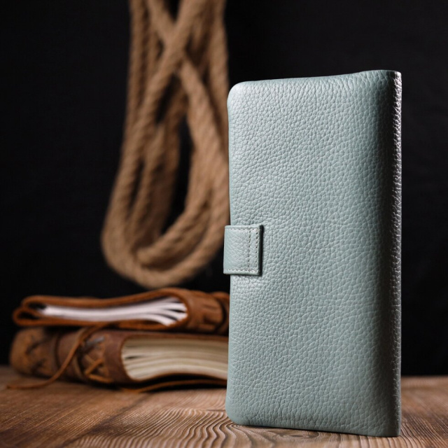 Чудовий жіночий гаманець із натуральної зернистої шкіри, в гарному бірюзовому кольорі. Внутрішній розворот складається з чотирьох відкритих відділень для купюр, однієї кишені з розширювачем на застібці, однієї прихованої кишені на блискавці, однієї кишені-перегородки на блискавці, однієї сітчастої кишеньки та дванадцяти секцій для пластикових карток. Складається аксесуар навпіл, з фіксацією на хлястик із магнітом. Такий гаманець з натуральної шкіри – це ідеальний варіант на кожен день для тих, хто цінує якість, зручність та комфорт.