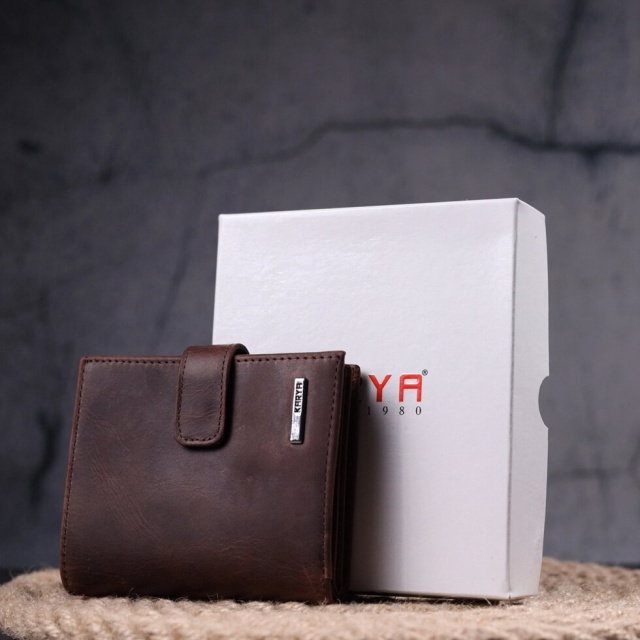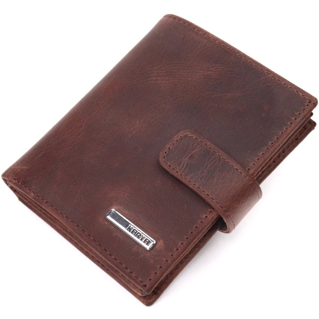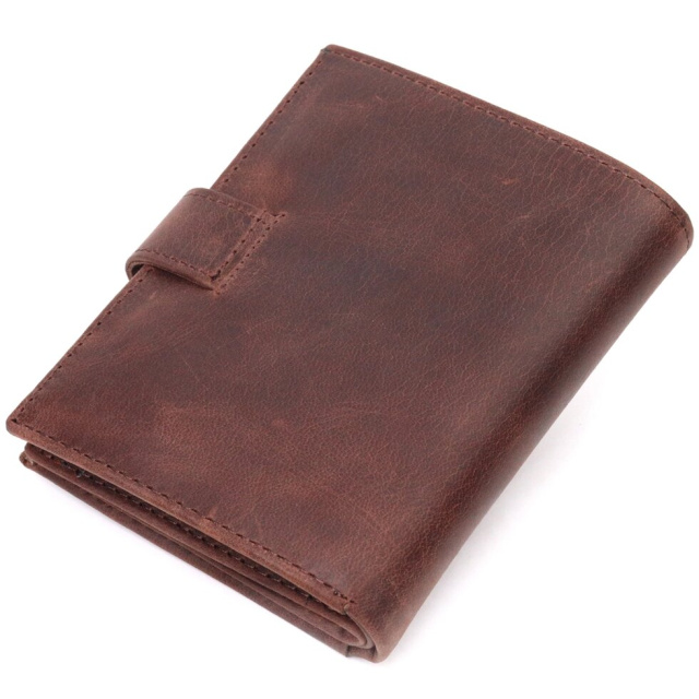Стильне компактне портмоне з натуральної вінтажної шкіри, що закривається хлястиком на кнопку. Виріб має велику кишеню для купюр. Усередині достатньо осередків для кредиток. Виріб продуманий для сучасної людини. Виріб має насичений коричневий колір. Оригінальний аксесуар вигідно виділить вас із натовпу. Гаманець стане чудовим подарунком для Ваших близьких.