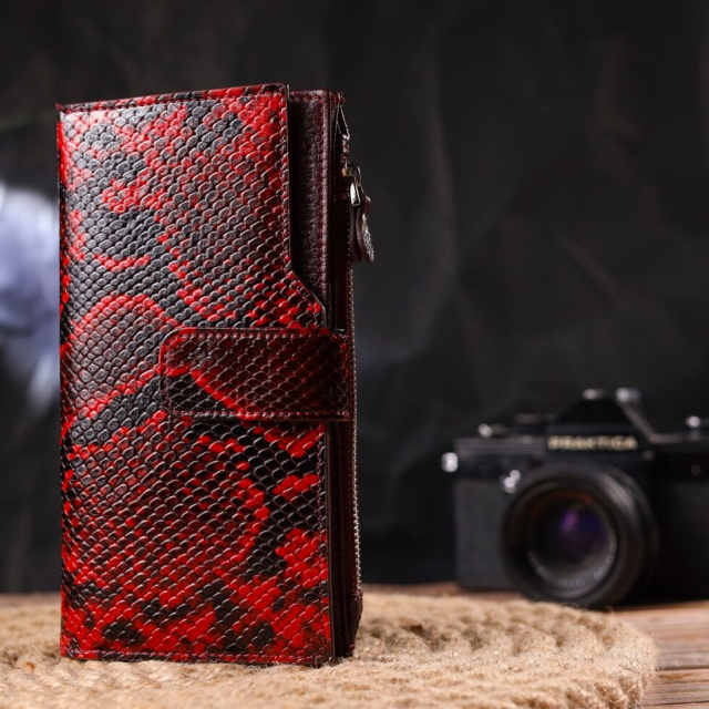 Жіночий місткий гаманець з натуральної фактурної шкіри з тисненням під змію. Аксесуар має шість прилеглих кишень, у які помістяться купюри всіх номіналів, містку монетницю та двадцять кишень для карток. Закривається аксесуар хлястиком на кнопку. Якщо Ви хочете порадувати себе та здивувати близьких, то неодмінно купуйте шкіряні аксесуари в нашому магазині, якість і ціна Вас однозначно порадує.