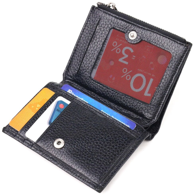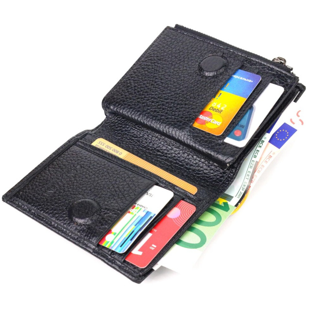 Практичний гаманець компактного розміру з натуральної шкіри. Аксесуар має відділення для купюр, монетницю, що закривається на блискавку, дві приховані кишені та десять осередків для карток, один під сіточкою. Закривається аксесуар у два складання на кнопку. Якісний шкіряний аксесуар завжди вважався показником смаку та достатку, саме такі вироби представлені у нашому магазині, у нас кожен знайде щось для себе.