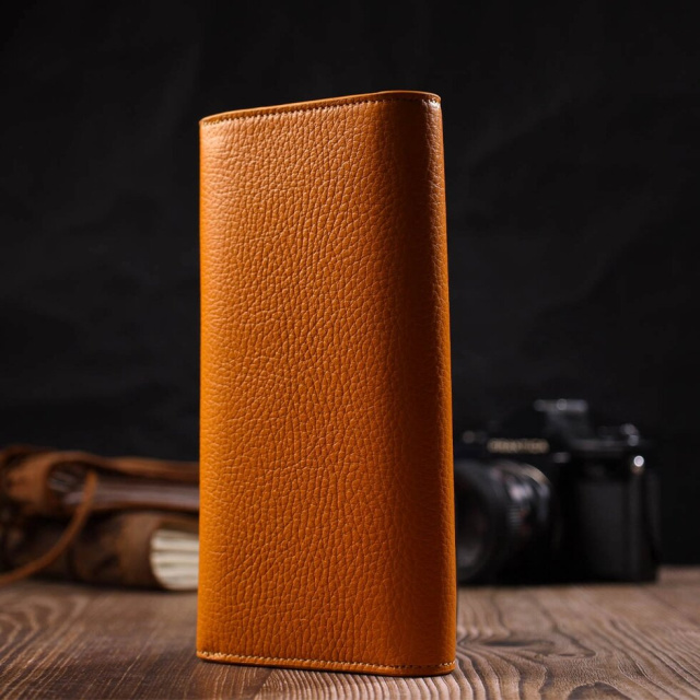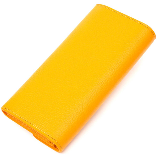 Модний жіночий гаманець із натуральної шкіри флотар, для якої характерна міцність, зносостійкість та зерниста фактура. Аксесуар складається з одного широкого відділення для купюр, дванадцяти осередків для пластикових карток, однієї прилеглої кишені та монетниці на блискавці. У виробі використано якісну фурнітуру золотистого кольору. Закривається гаманець клапаном на кнопку. Купуючи цей шкіряний гаманець, Ви не тільки набуваєте стильної речі, але й отримуєте якісний аксесуар, який прослужить не один рік.