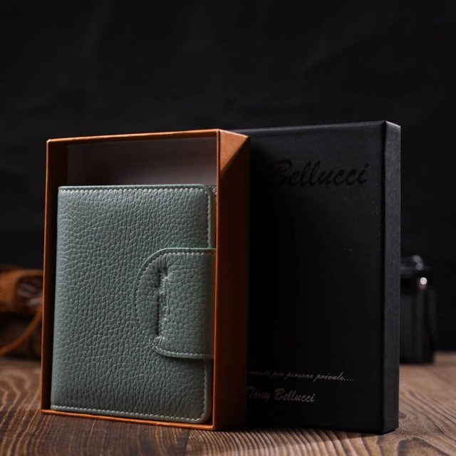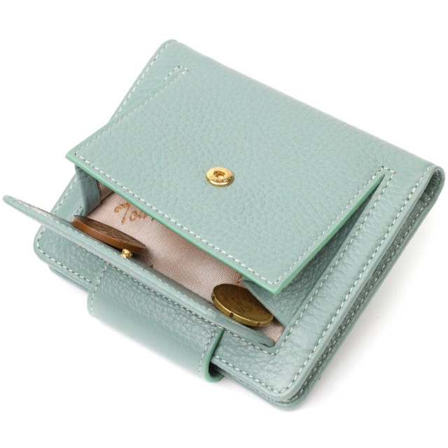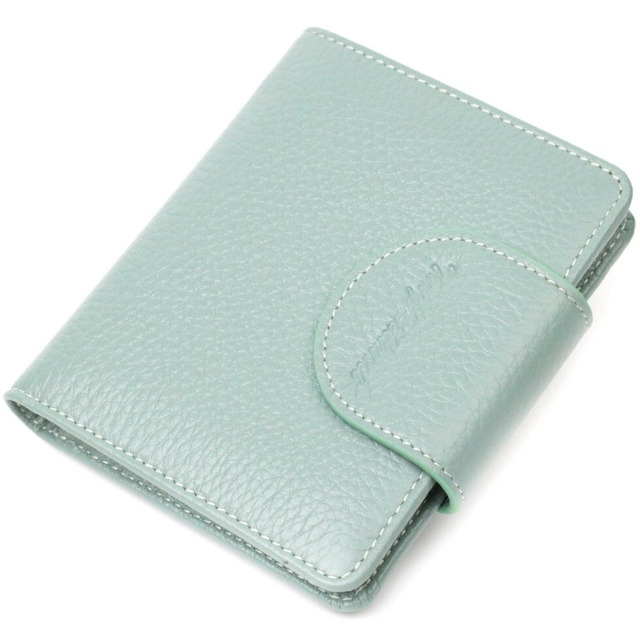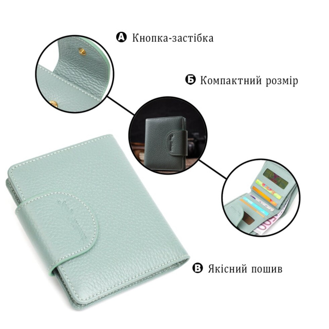 Модний місткий жіночий гаманець із натуральної шкіри. Аксесуар складається з двох широких відділень для купюр, дев'яти осередків для пластикових карток, двох прилеглих кишень, кишені під сіточкою та монетниці під клапаном зовні. У виробі використано якісну фурнітуру золотистого кольору. Закривається гаманець шкіряним хлястиком на кнопку. Купуючи цей шкіряний гаманець, Ви не тільки набуваєте стильної речі, але й отримуєте якісний аксесуар, який прослужить не один рік.