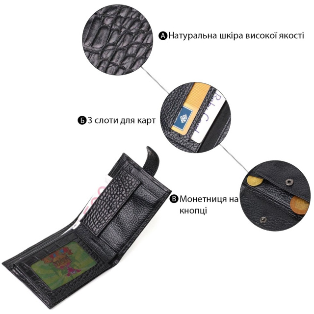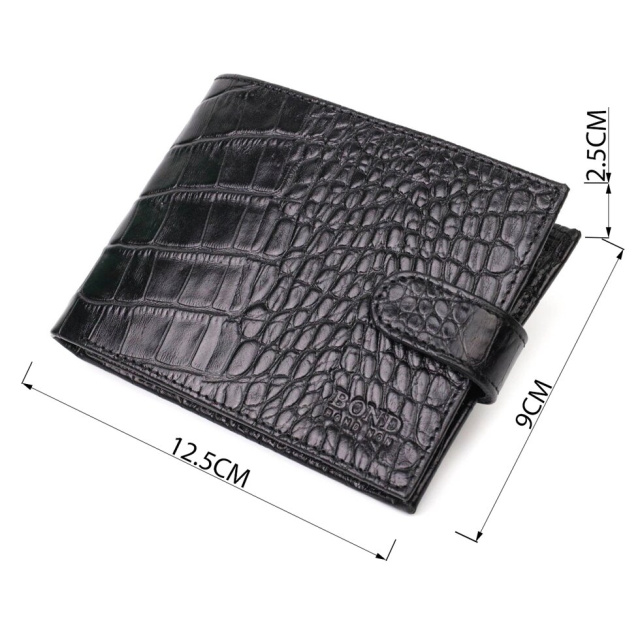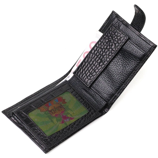 Фактурний гаманець середнього розміру, горизонтального типу, виготовлений з добротної натуральної шкіри, з тисненням під крокодила. У цей аксесуар чудово поміщаються купюри всіх номіналів. Виріб складається з двох відділень для купюр, трьох осередків для кредиток, монетниці та двох відділень під сіткою під документи. Закривається гаманець навпіл шкіряним хлястиком на кнопку. Вироби з натуральної шкіри завжди будуть чудовим подарунком для близької людини.