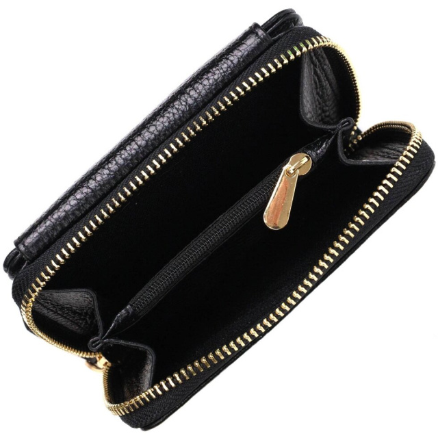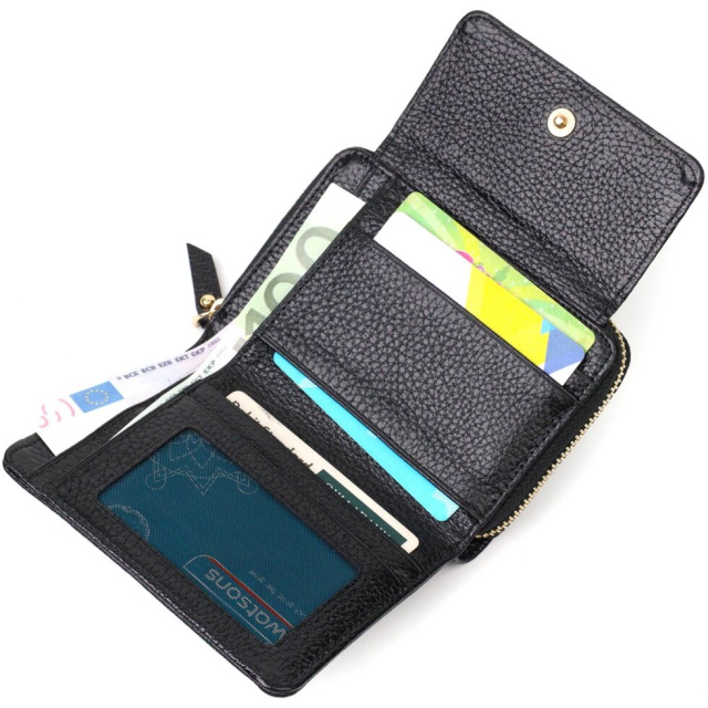 Зручний жіночий гаманець із натуральної шкіри. Аксесуар складається з двох широких відділень для купюр, трьох осередків для пластикових карток, двох прилеглих кишень та монетниці на блискавці, з кишенею-перегородкою на змійці. У виробі використано якісну фурнітуру золотистого кольору. Закривається гаманець клапаном на кнопку. На клапані всередині золотистий логотип компанії виробника. Купуючи цей шкіряний гаманець, Ви не тільки набуваєте стильної речі, але й отримуєте якісний аксесуар, який прослужить не один рік.