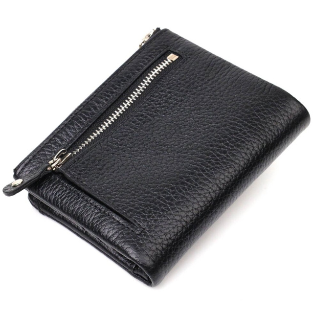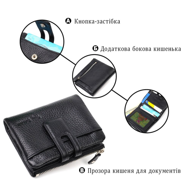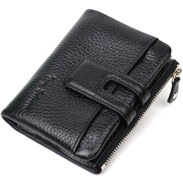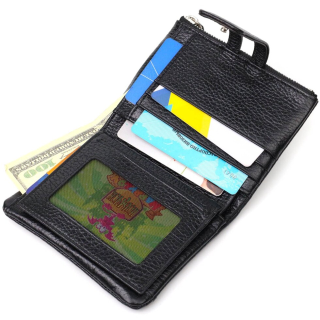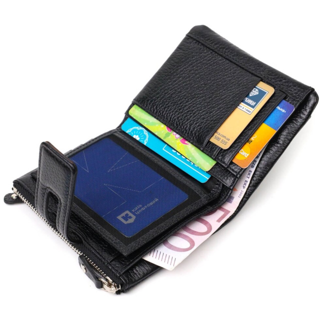 Супер функціональний гаманець з натуральної шкіри, який складається з одного місткого відділення для купюр, шести осередків для пластикових карток, двох кишень під сіточкою, для документів, п'яти прилеглих кишень та двох кишеньок на блискавках. У виробі використано якісну фурнітуру. Закривається гаманець хлястиком на кнопку.