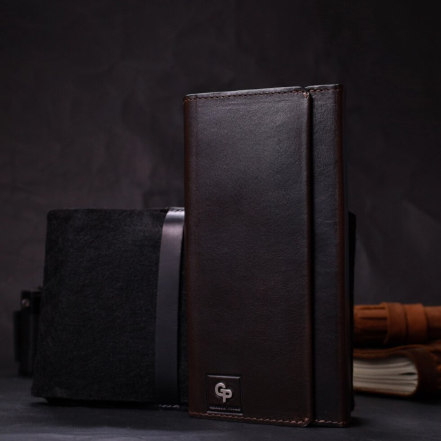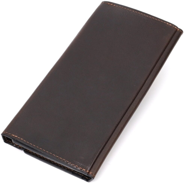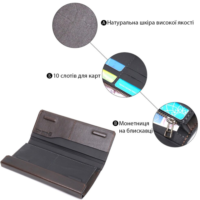 Функціональний гаманець який складається з двох частин (кишеня для мобільного знизу аксесуара на клапані з магнітами та основна частина зверху, для купюр, кредиток та дрібниць, яка закривається також на клапан з магнітами). Аксесуар пошитий з італійської гладкої шкіри найвищої якості у гарному коричневому кольорі. Сучасний дизайн, елітна шкіра, якісна фурнітура – все це підкреслює справді якісну річ. Всередині портмоне виконаний також з натуральної шкіри, без тканинної підкладки. Аксесуар підкреслить вашу індивідуальність та відмінний смак. Впевнені, що такий подарунок оцінить будь-який чоловік. Запакований виріб у гарний повстяний чохол.