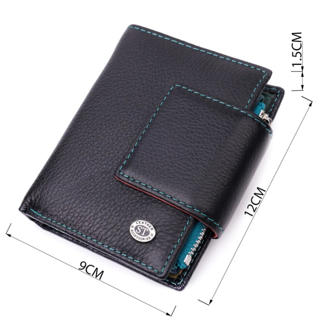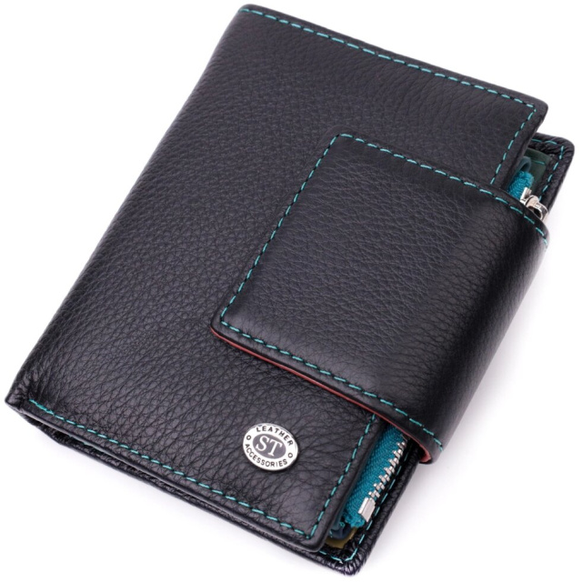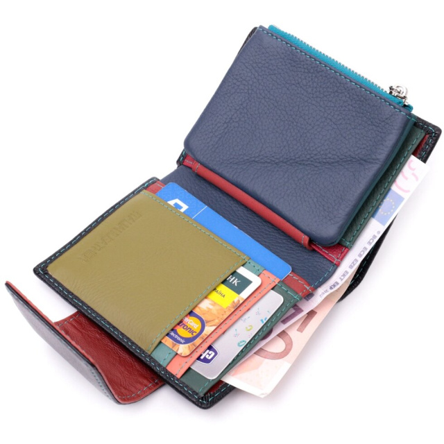 Модне вертикальне портмоне в два додавання зручного розміру з натуральної шкіри найвищої якості. Гаманець чорного кольору зовні та різнобарвний усередині, що дуже стильно та сучасно. Шкіряне портмоне дуже практичне і служить досить довго. Аксесуар складається з основного відділення зі шкіряною перегородкою для купюр, монетниці, чотирьох осередків для карт, прозорого віконця для пропуску та чотирьох прихованих кишень. Портмоне доповнено надійною фурнітурою і прошито по краю рівним рядком бірюзового кольору. Укомплектований гаманець у фірмову картонну коробку білого кольору. Виріб стане ідеальним подарунком для дівчини будь-якого віку.