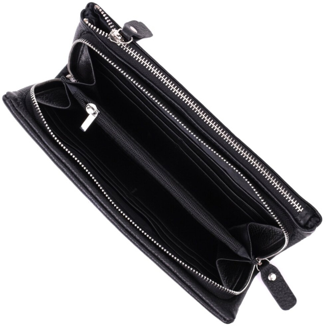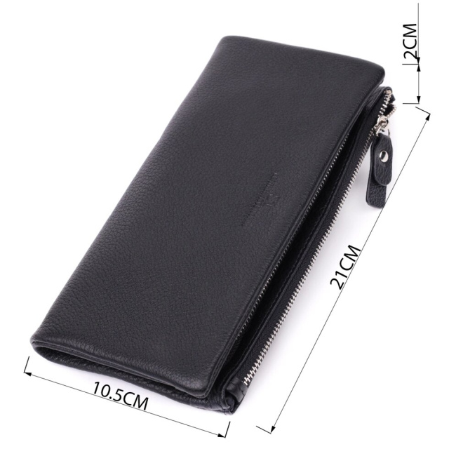 Зручний та місткий клатч із натуральної шкіри високої якості. Аксесуар складається з двох основних відділень, в яких знаходяться дві широкі кишені для купюр, вісім слотів для пластикових карток, дві прилеглі кишені, а також кишеня на блискавці для монет. Модель оптимального розміру і носиться як в руках, так і на зап'ясті, для цього передбачений шкіряний кистьовий ремінь, що знімається. На лицьовій стороні тиснений логотип бренду. У клатч легко поміститься мобільний телефон і документи. Місткі кишеньки зручно розмістять усі ваші особисті речі. Аксесуар упакований у фірмову коробку