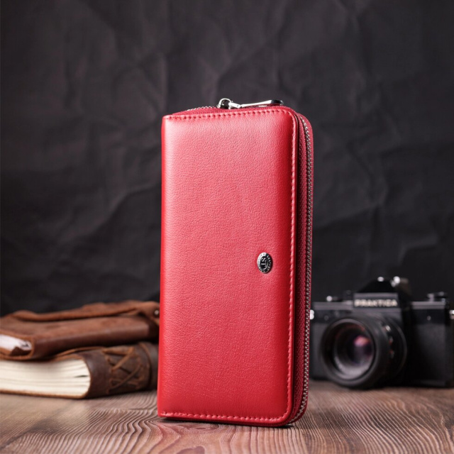Яскравий клатч для ділової та стильної жінки з натуральної шкіри. Аксесуар має три великі відділення для купюр, вісім осередків для карток, дві прилеглі кишені, одну приховану кишеню, кишеню на блискавці та монетницю на блискавці зовні. Носити цю модель зручно в руці або за допомогою знімного кистьового ременя. Закривається аксесуар на блискавку. Купуючи шкіряний аксесуар цієї фірми собі або на подарунок, будьте певні, що він радуватиме око не один рік