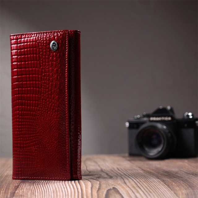 Яскравий гаманець у два складання для ділових та стильних жінок. Виконаний з м'якої першокласної лакованої шкіри високої якості з тисненням під рептилію. Колір виробу – червоний. Має одне основне відділення, яке закривається клапаном на магніти. Усередині є багато відділень для купюр, осередків для карт та монетниця. На лицьовій стороні, в правому нижньому кутку, розташований металевий логотип виробника, що є запорукою якості виробу. Запакований аксесуар у білу щільну картонну коробку з фірмовим логотипом.