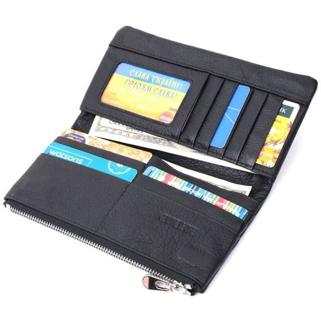 Універсальний гаманець з натуральної якісної шкіри, який підійде як жінкам, так і чоловікам. Модель має зручний розмір та закривається на магніти. Зовні можна побачити відділення монет, яке закривається на блискавку. Аксесуар всередині оснащений двома відділеннями для купюр та дванадцятьма осередками для карток. Запакований аксесуар у білу щільну картонну коробку з фірмовим логотипом.