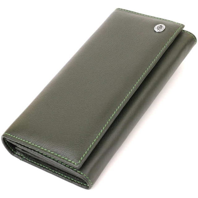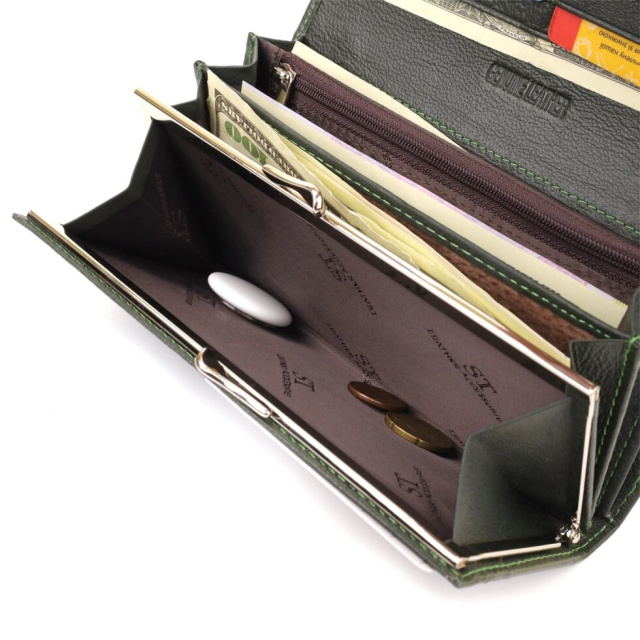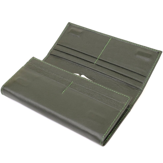 Елегантний жіночий гаманець глибокий зелений колір. Виконано аксесуар із натуральної шкіри. Виглядає дуже модно та стильно. До того ж гаманець ще й дуже практичний, тому що має всі необхідні відділення та кишені для Ваших цінностей. Усередині є три основні великі відділення для купюр, відділення на блискавці для інших цінностей, кишені для кредитних карток і зручна монетниця на металевій клямці. Також є одне зовнішнє містке відділення. Закривається цей гаманець на зручні магніти, які розташовані з обох боків. Запаковано виріб у білу картонну коробку.