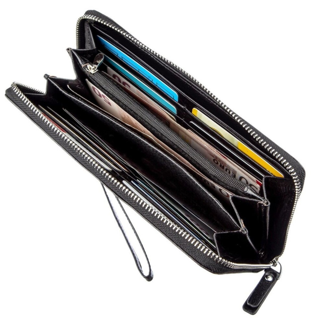 Дуже містке і практичне чоловіче портмоне-клатч з високоякісної шкіри чорного кольору для впевненого в собі чоловіка. Має все необхідне, щоб стати Вам незамінним аксесуаром в повсякденному життя. Ви з легкістю помістите в нього паперові купюри, монети, документи і картки. Таке портмоне неодмінно підкреслить високий рівень свого власника. Цей клатч можна носити як в сумочці або портфелі, так і просто на зап'ясті за допомогою спеціального ремінця. Якщо ж Ви вирішите такий аксесуар подарувати близькій людині, то Вам гарантовано будуть дуже вдячні. Також зазначаємо, що упаковано портмоне-клатч в фірмову картонну коробку.
