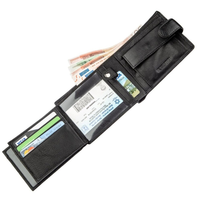 Універсальний гаманець для чоловіків з натуральної високоякісної шкіри на кнопці. Виконано в чорному аристократичному кольорі, що дуже практично і зручно. В гаманці є достатня кількість відділень і кишень для різних цінностей, в тому числі і монетниця на кнопці. Розміри виробу дозволяють носити його як в кишені, так і в сумці або барсетку. Гаманець має діловий і стриманий дизайн і підійде для чоловіків різного соціального статусу. Даний аксесуар стане прекрасним придбанням для Вас особисто або чудовим презентом для коханої людини. Упаковка гаманця представлена у вигляді картонної коробки з фірмовим логотипом білого кольору.