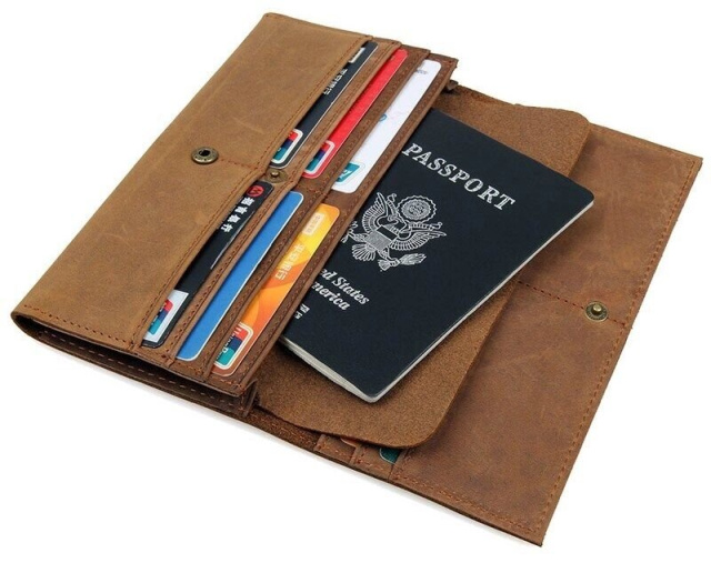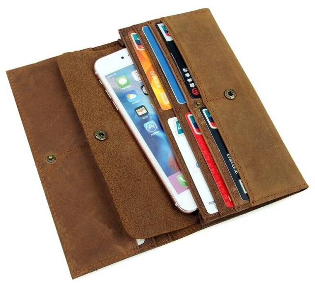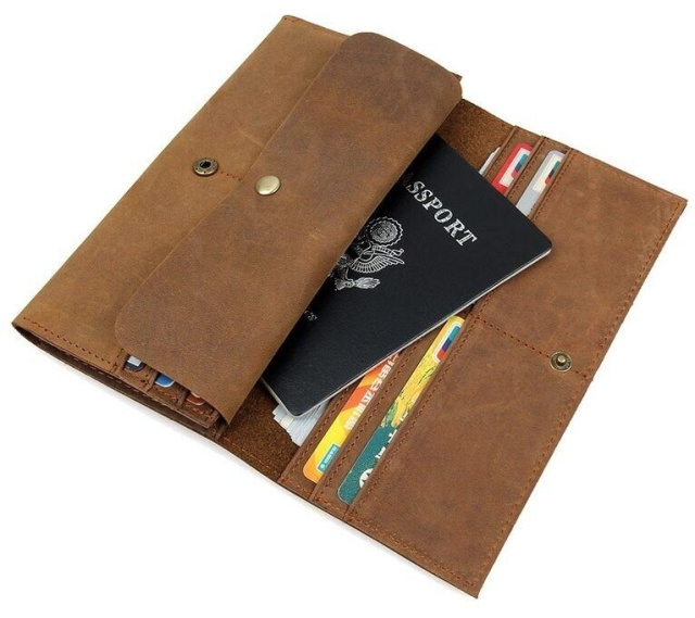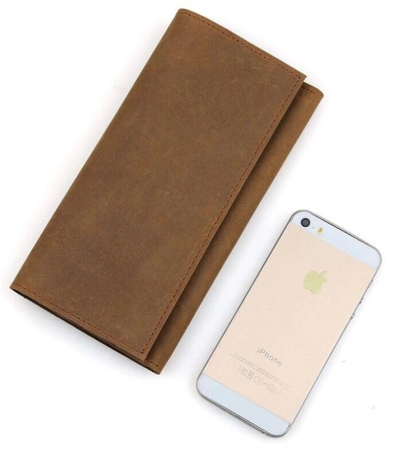 Добротний гаманець з натуральної вінтажної шкіри найвищої якості. Шкіра, з якої виконано виріб, приємна на дотик. Дана модель може використовуватися, як чоловіками, так і жінками. Колір фурнітури: латунь. Гаманець акуратно прошитий надміцною ниткою світло-коричневого кольору. Купюрник поставляється в текстильному мішечку білого кольору.