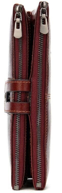 Стильний і місткий жіночий гаманець. У такій моделі багато місця для ваших кредиток і ви без проблем зможете помістити велику кількість купюр і монет. Особливістю такої моделі є те, що ви можете самі регулювати його наповненість за допомогою двох кнопок на лицьовій стороні. Гаманець досить об'ємний. Гаманець прошитий по краях акуратно коричневим рядком. Аксесуар виконаний з урахуванням всіх модних тенденцій і побажань клієнтів. Гаманець м'який і приємний на дотик. Бордовий колір ідеальне поєднання розкоші і класики.