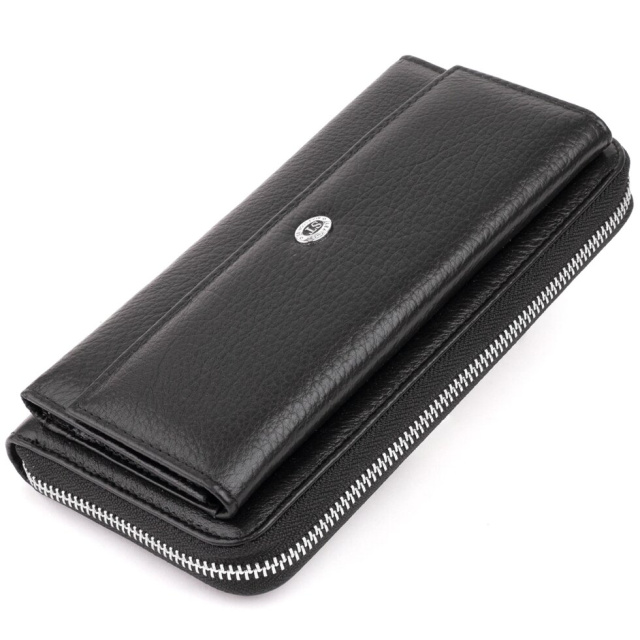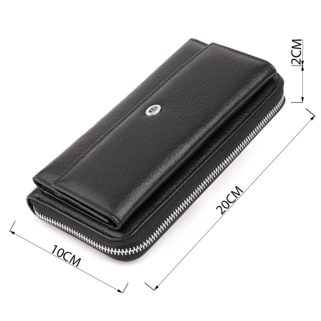 Класичний чорний місткий гаманець з натуральної шкіри. Модель м'яка і еластична з двох автономних частин (одна для купюр, друга - для карт). Усередині модель виготовлена з міцного текстилю в поєднанні зі шкірою. Виріб можна також носити на ремінці-петельці на зап'ясті. Дуже практичний гаманець не залишить байдужою жодну жінку. Класичний чорний колір підходить під все тому є дуже універсальним. При покупці гаманець упакований в картонну фірмову коробку.