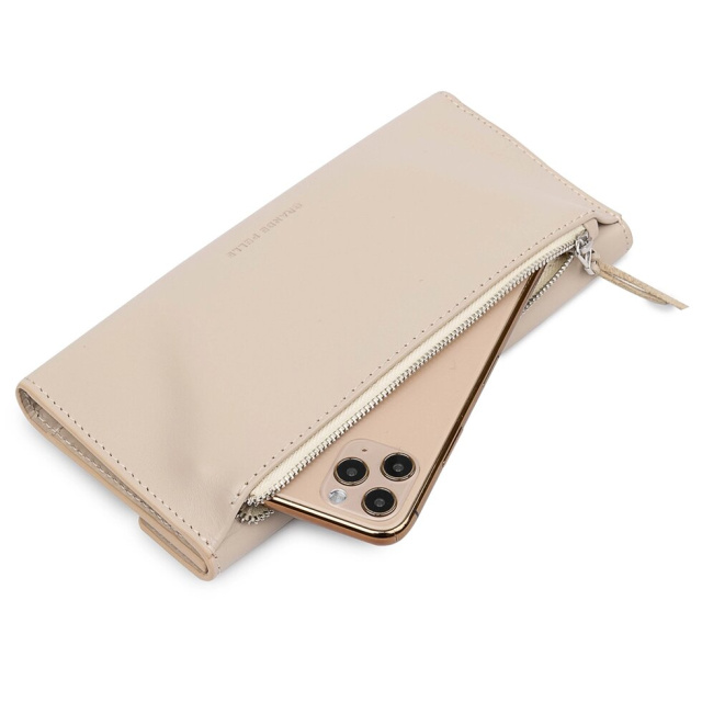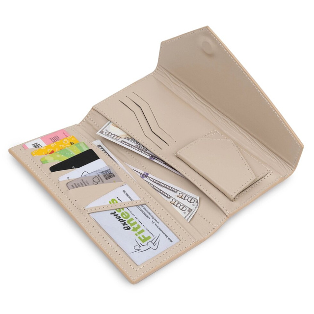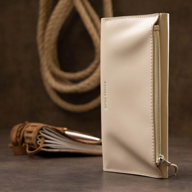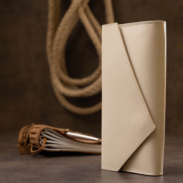Місткий оригінальний жіночий гаманець, який також можна застосовувати у вигляді клатча. Виконано в красивому бежевому кольорі, тому підійде під будь-який одяг. Матеріал виготовлення - натуральна високоякісна шкіра з високою стійкістю до зносу. Наповнення представлено у вигляді зручних відділень для купюр, монет, різних карток і інших цінних речей. Упакований аксесуар в фірмовий чохол.