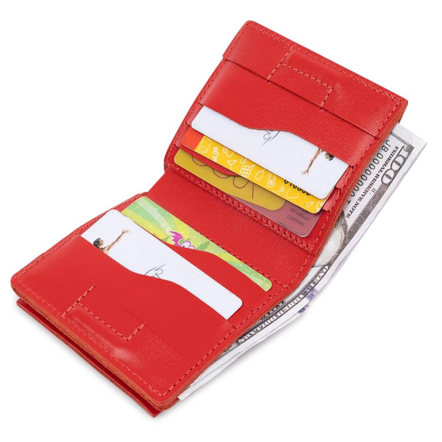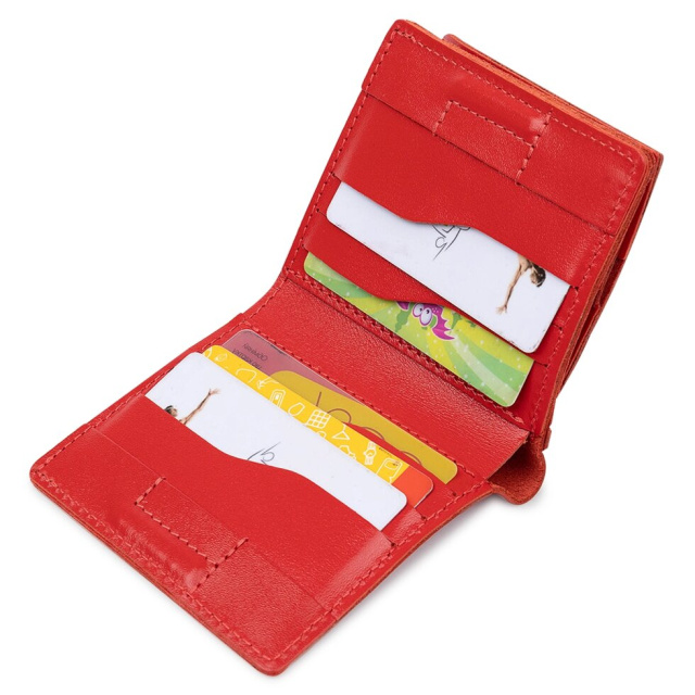 Невелике, але містке жіноче портмоне з оригінальною монетницею на кнопці. Матеріал виготовлення - зносостійка натуральна шкіра високого класу. Всередині є відділення для купюр і слоти для візитних і кредитних карток. Таке портмоне не займає багато місця, тому поміститься в сумочку будь-якого розміру.
