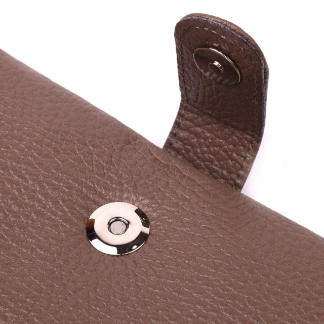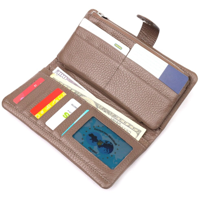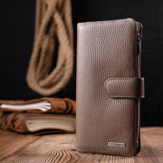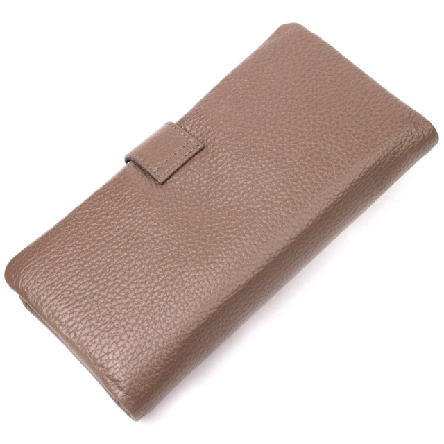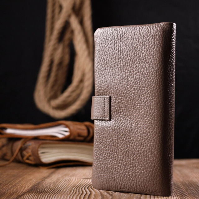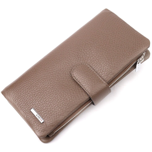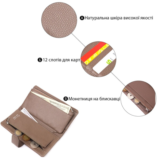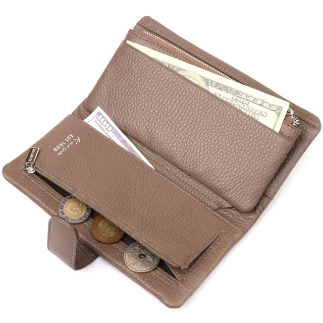 Стильний гаманець з натуральної зернистої шкіри, в бежевому кольорі. Внутрішній розворот складається з чотирьох відкритих відділень для купюр, однієї кишені з розширювачем на застібці, однієї прихованої кишені на блискавці, однієї кишені-перегородки на блискавці, однієї сітчастої кишеньки та дванадцяти секцій для пластикових карток. Складається аксесуар навпіл, з фіксацією на хлястик із магнітом. Такий гаманець з натуральної шкіри – це ідеальний варіант на кожен день для тих, хто цінує якість, зручність та комфорт.
