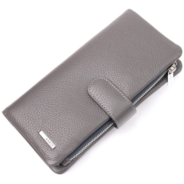 Вертикальний жіночий гаманець з натуральної зернистої шкіри, в сірому кольорі. Внутрішній розворот складається з чотирьох відкритих відділень для купюр, однієї кишені з розширювачем на застібці, однієї прихованої кишені на блискавці, однієї кишені-перегородки на блискавці, однієї сітчастої кишеньки та дванадцяти секцій для пластикових карток. Складається аксесуар навпіл, з фіксацією на хлястик із магнітом. Такий гаманець з натуральної шкіри – це ідеальний варіант на кожен день для тих, хто цінує якість, зручність та комфорт.