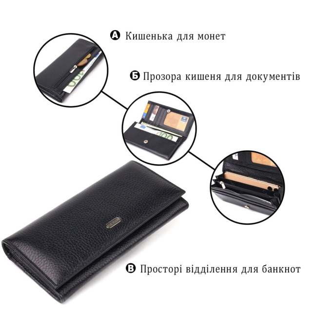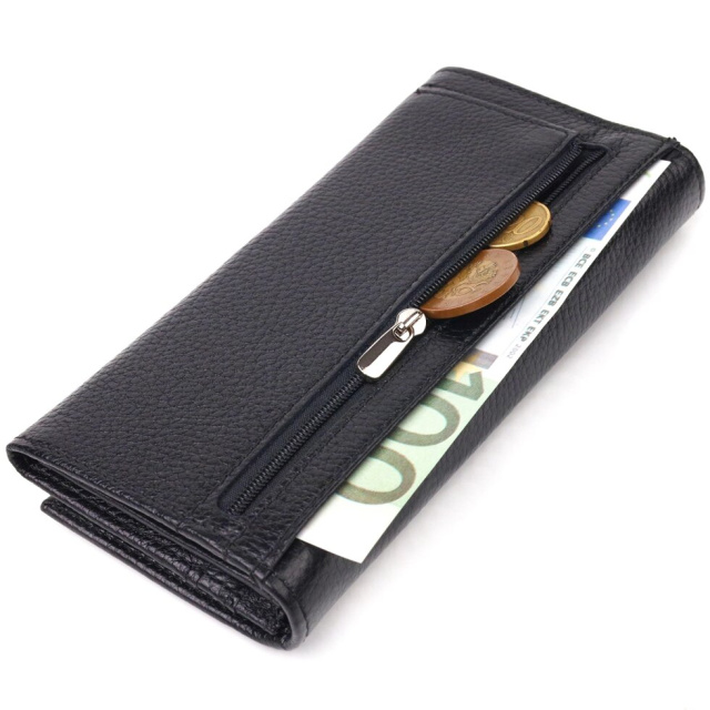 Чудовий жіночий гаманець з натуральної зернистої шкіри. Аксесуар має три широкі відділення для купюр, з двома перегородками, одна перегородка закривається на блискавку, містку монетницю зовні, чотири приховані кишені та шість кишень для карток. Закривається аксесуар клапаном на кнопку. Якщо Ви хочете порадувати себе та здивувати близьких, то неодмінно купуйте шкіряні аксесуари в нашому магазині, якість і ціна Вас однозначно порадує.