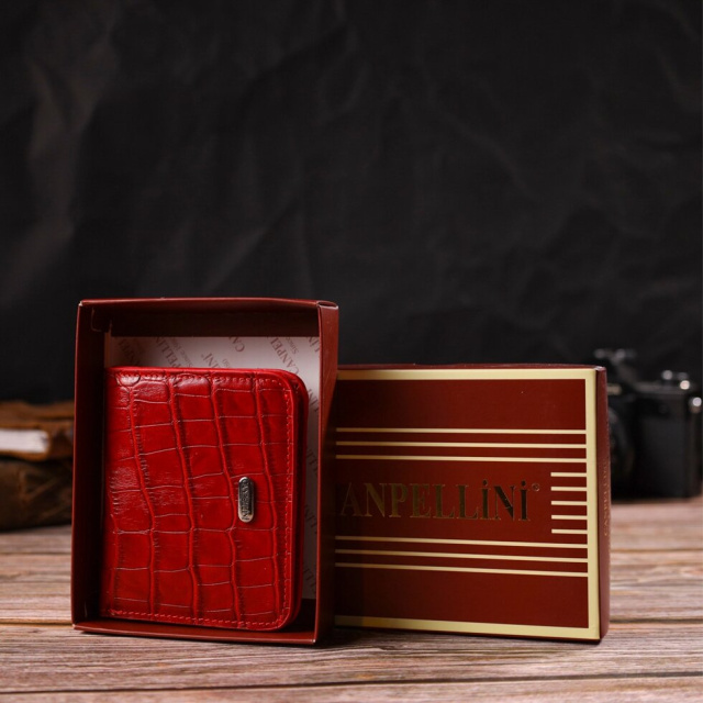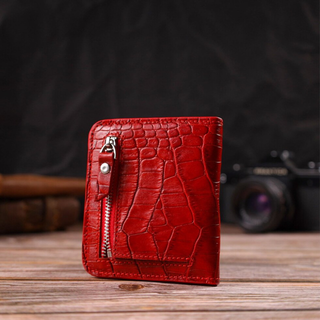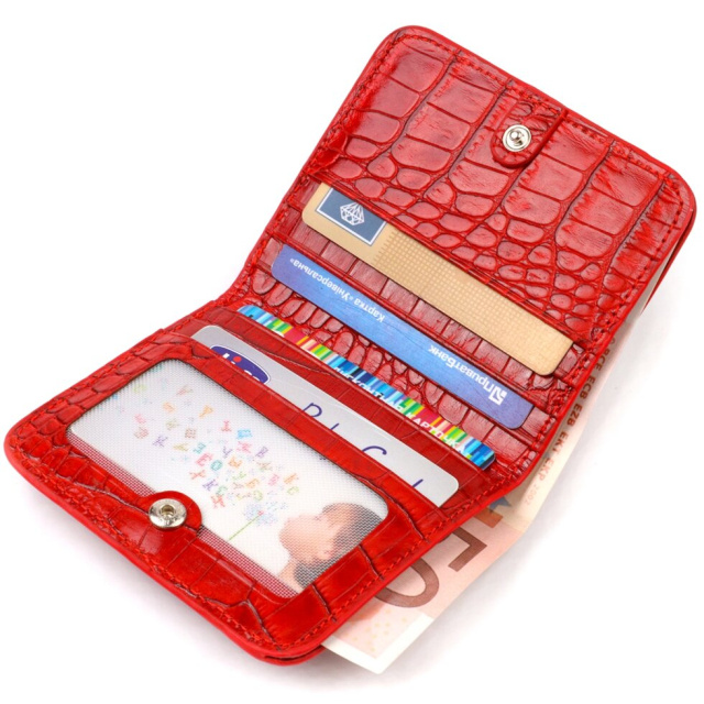 Яскравий компактний гаманець із натуральної шкіри із тисненням під крокодила, для стильних дівчат та жінок. Аксесуар має одне основне відділення з тканинною перегородкою в яке поміщаються купюри всіх номіналів, п'ять кишень для карток (одна під сіточкою), дві приховані кишені та монетницю. Закривається аксесуар навпіл на кнопку. На лицьовій стороні, вгорі посередині металевий логотип компанії виробника. Купуючи шкіряний аксесуар цієї фірми, собі чи на подарунок, будьте певні, що він прослужить Вам не один рік.