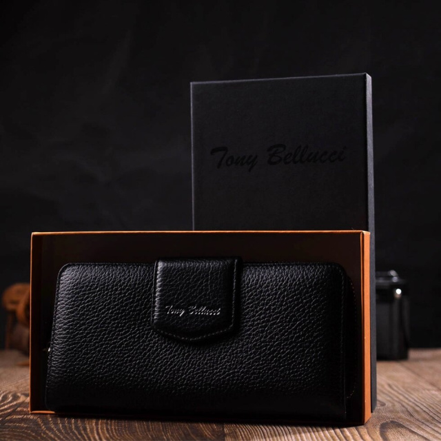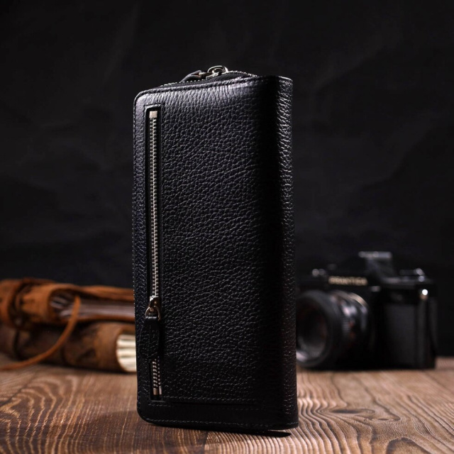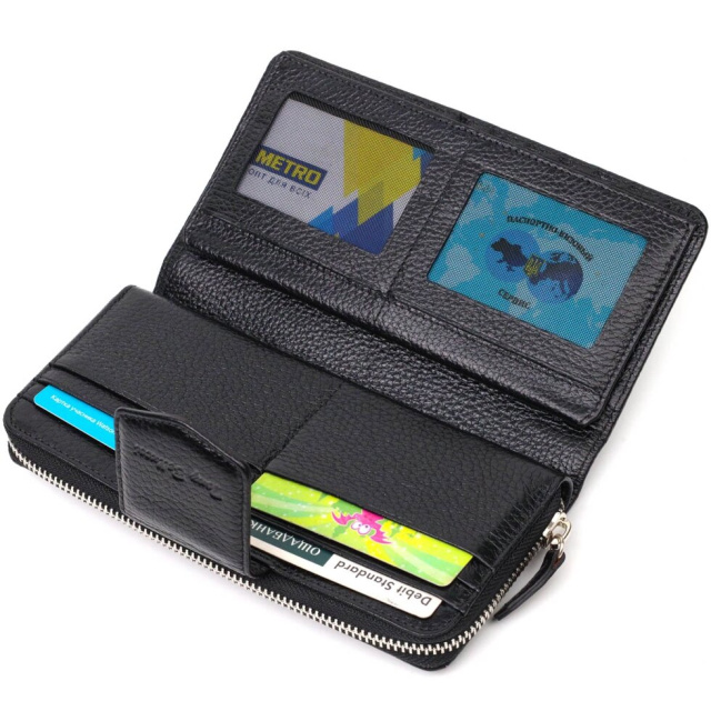 Місткий жіночий гаманець з натуральної шкіри флотар, для якої характерна міцність, зносостійкість та зерниста фактура. Аксесуар складається з одного місткого основного відділення з кишенею-перегородкою на блискавці, монетниці, тринадцяти осередків для пластикових карток, двох прилеглих кишень та трьох відділень під сіточкою для документів. У виробі використано якісну фурнітуру сріблястого кольору. Закривається гаманець на блискавку – основне відділення, та на хлястик з кнопкою – блок для карт. Купуючи шкіряний гаманець собі або на подарунок усі хочуть отримати якісну та стильну річ, саме такі вироби представлені у нашому магазині, а наші досвідчені менеджери допоможуть визначитися з вибором.