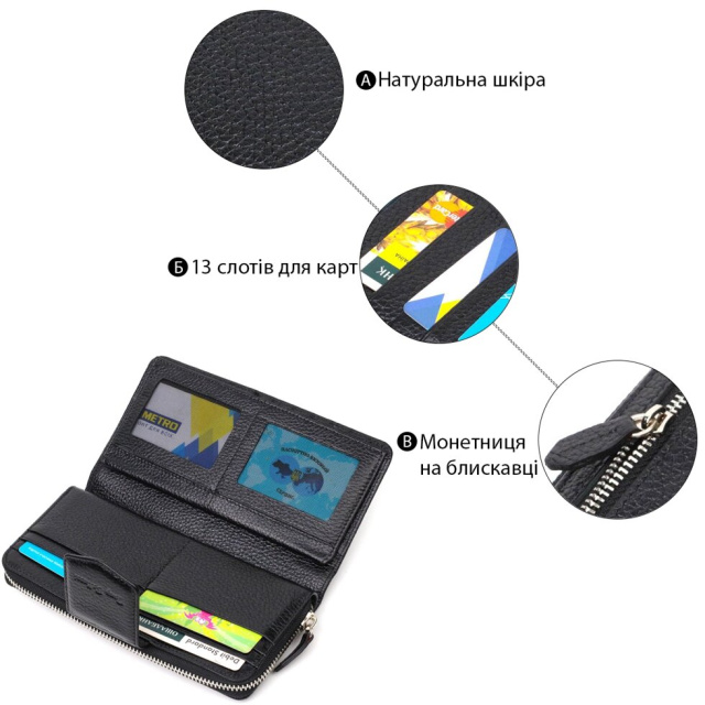 - широке відділення для купюр із кишенею-перегородкою на блискавці;