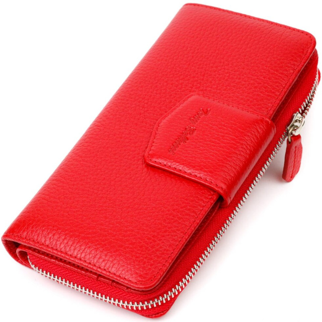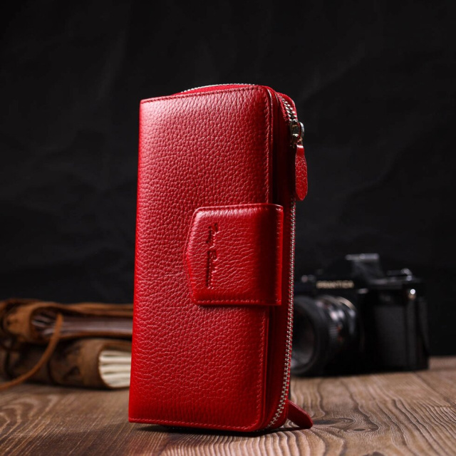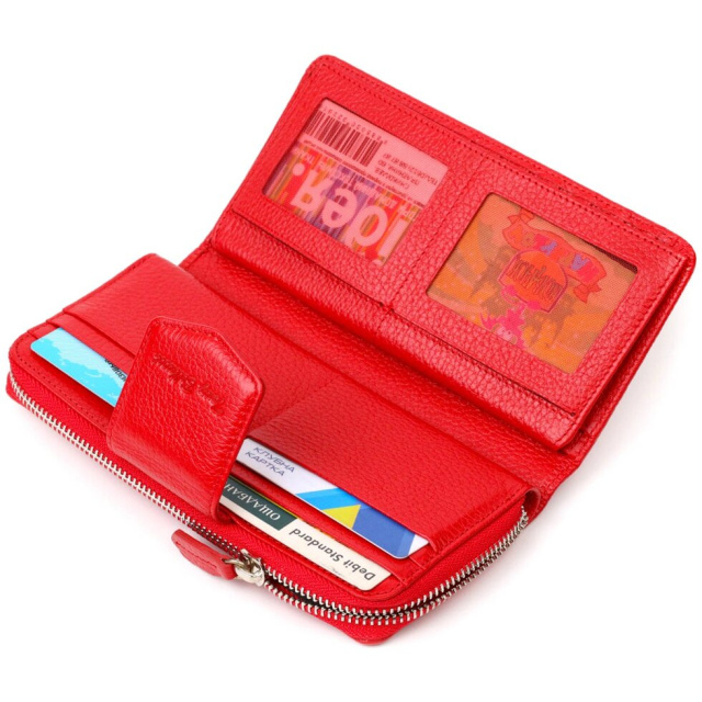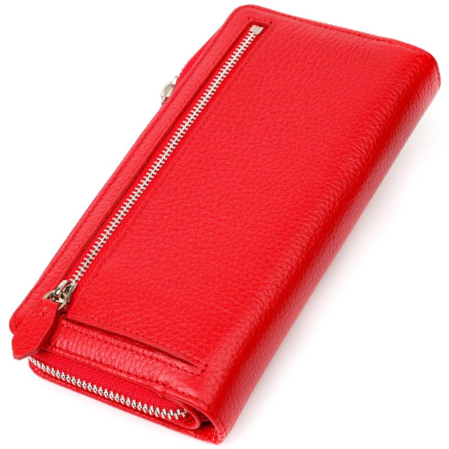 Яскравий жіночий гаманець із натуральної шкіри флотар, для якої характерна міцність, зносостійкість та зерниста фактура. Аксесуар складається з одного місткого основного відділення з кишенею-перегородкою на блискавці, монетниці, тринадцяти осередків для пластикових карток, двох прилеглих кишень та трьох відділень під сіточкою для документів. У виробі використано якісну фурнітуру сріблястого кольору. Закривається гаманець на блискавку – основне відділення, та на хлястик з кнопкою – блок для карт. Купуючи шкіряний гаманець собі або на подарунок усі хочуть отримати якісну та стильну річ, саме такі вироби представлені у нашому магазині, а наші досвідчені менеджери допоможуть визначитися з вибором.