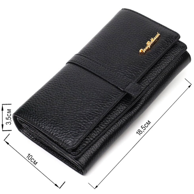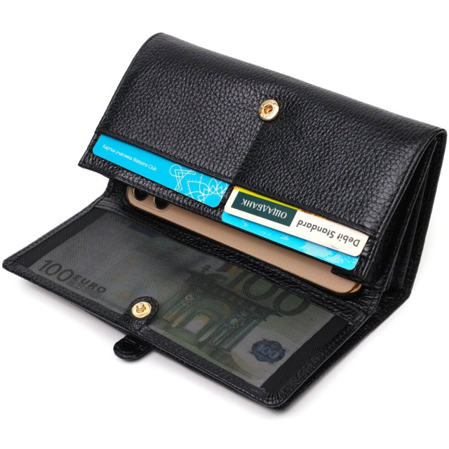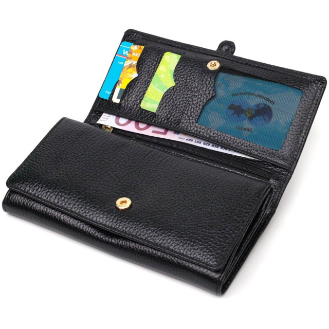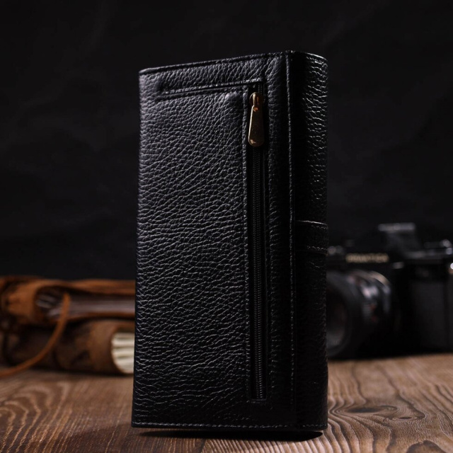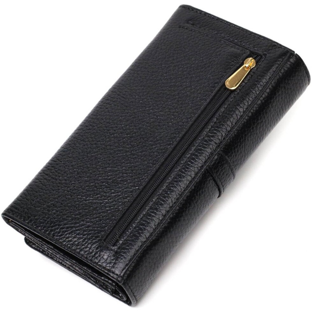 Стильний жіночий гаманець із натуральної шкіри флотар, для якої характерна міцність, зносостійкість та зерниста фактура. Аксесуар складається з чотирьох широких відділень для купюр, одинадцяти осередків для пластикових карток, двох прилеглих кишень та трьох кишень на блискавках, які можна використовувати як монетниці. У виробі використано якісну фурнітуру золотистого кольору. Закривається гаманець клапаном на кнопку. Купуючи шкіряний гаманець собі або на подарунок усі хочуть отримати якісну та стильну річ, саме такі вироби представлені у нашому магазині, а наші досвідчені менеджери допоможуть визначитися з вибором.