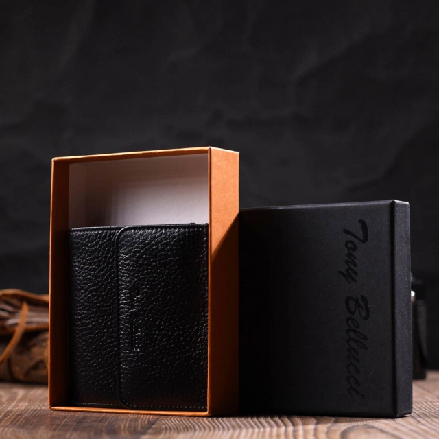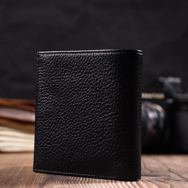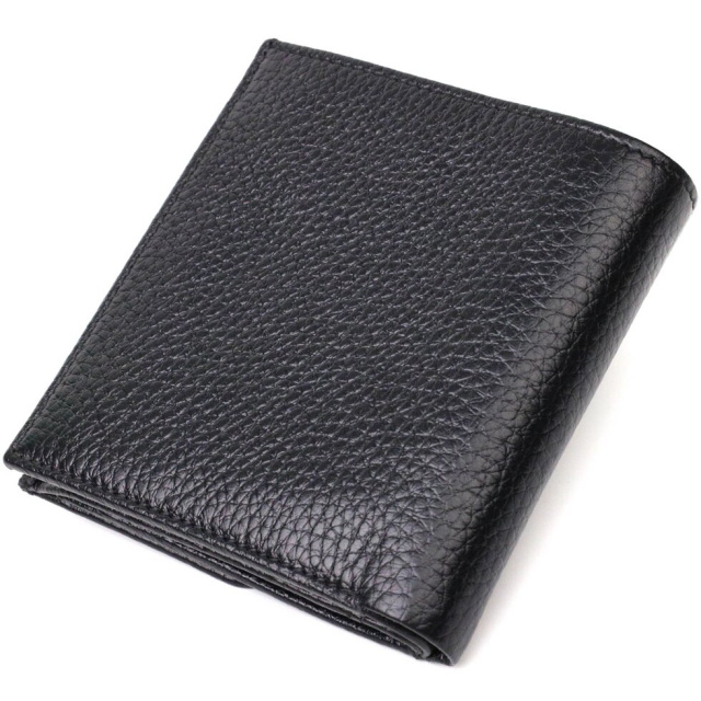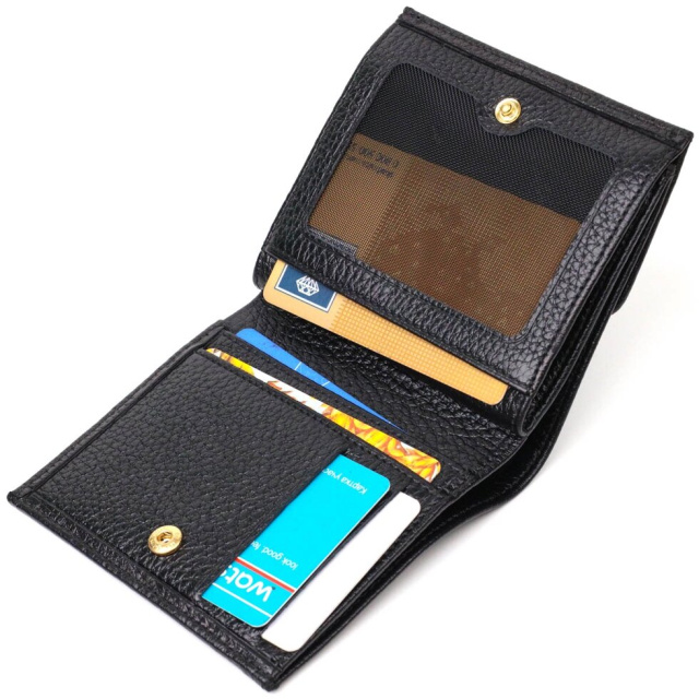 Компактний жіночий гаманець із натуральної шкіри. Аксесуар складається з двох широких відділень для купюр, трьох осередків для пластикових карток, трьох прилеглих кишень, кишені під сіточкою та монетниці під клапаном зовні. У виробі використано якісну фурнітуру золотистого кольору. Закривається гаманець на кнопку. Відмінний шкіряний гаманець, який прослужить не один рік.